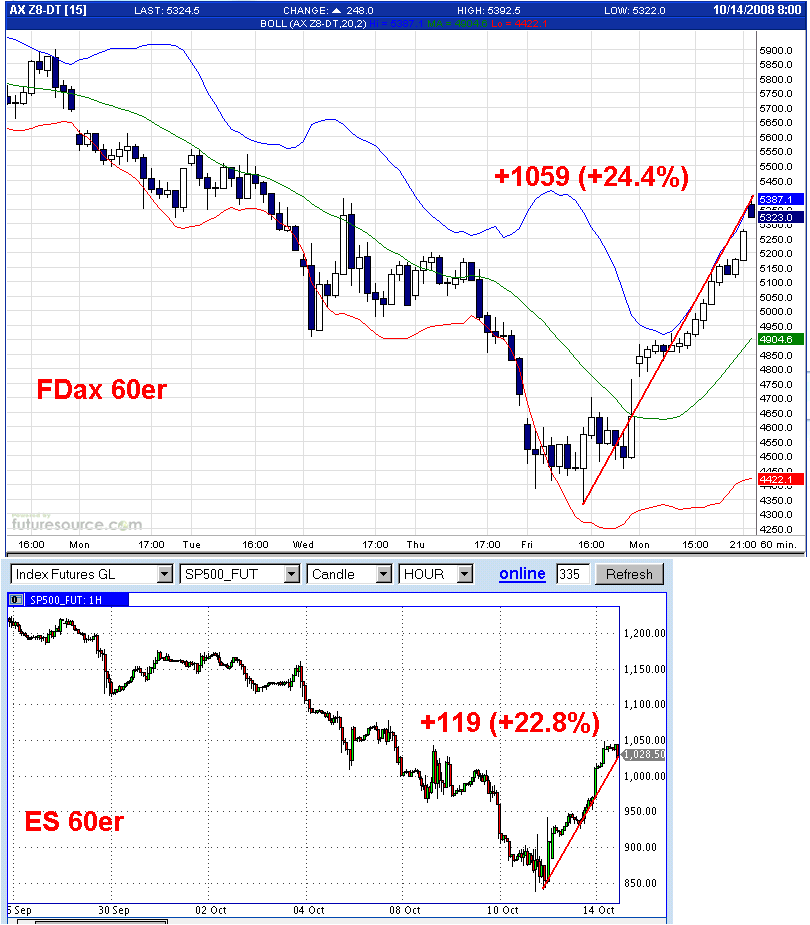 Der DAX, der in der vergangenen Woche um mehr als 20 Prozent eingebrochen war, kletterte daraufhin gestern wieder über die 5000-Punkte-Marke. Ein Plus von elf Prozent - gemessen an den Schlusskursen war dies einer der größten Tagesgewinne in der 20-jährigen Geschichte des DAX. Auch in London, Paris und Zürich schossen die Börsenindizes um fünf bis sieben Prozent in die Höhe.