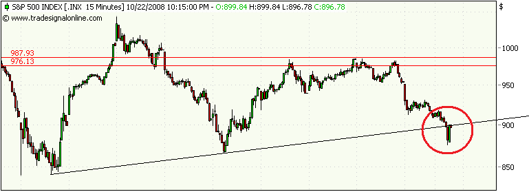 The Dow opened the day with a big downside break through the bottom of the tight consolidation at 9,000 this morning and proceeded to drop 700 points before ending the day lower by 514 points, as seen in the 15 Minute Chart. The Dow dropped precisely to the lower boundary of the large triangle pattern, which we will continue to monitor for a potential breakout down the road.