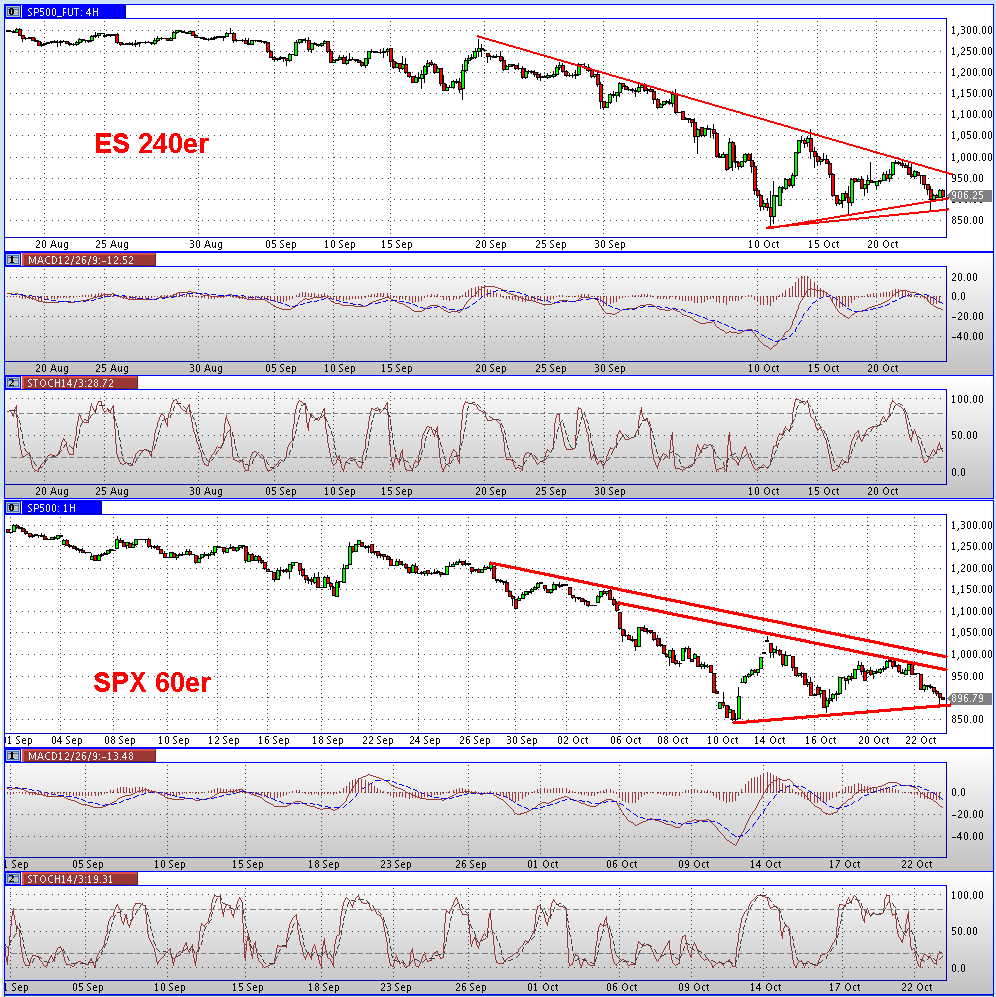 The Daily and 60 Minute Charts show the Dow continues to wind up within the boundaries of the large, 2,240 point triangle pattern, which has continued to evolve over the last 2 1/2 weeks. Eventually, a breakout from this triangle could spark a major directional push in the index, which could be worth up to 2,240 points. Keep an eye on today's lows at 8,300 for signs of a downside break, and 9,300 for an upside break.