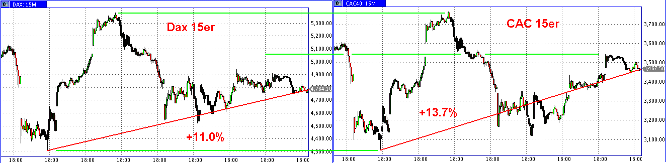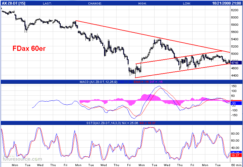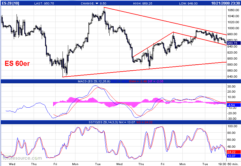 The Dow broke through 8,600 late in the day and dropped 300 points before bouncing 300 to the Close, ending the day at the 8,600 fulcrum, seen in the 5 Minute Chart. Watch this level closely for early direction.