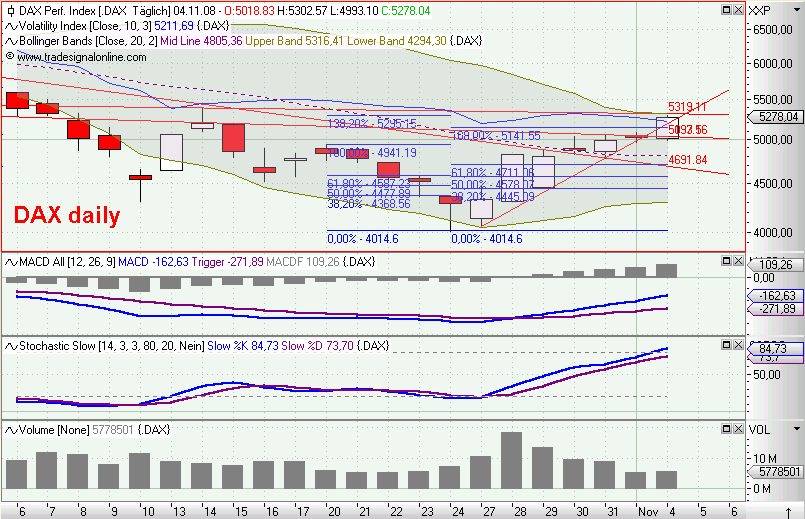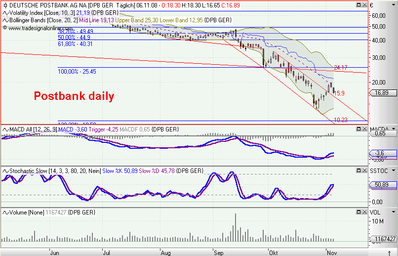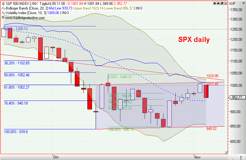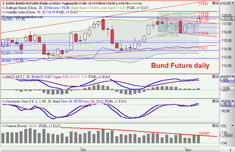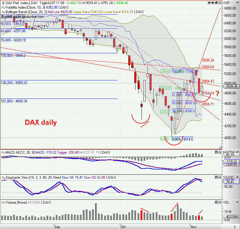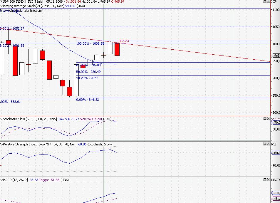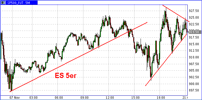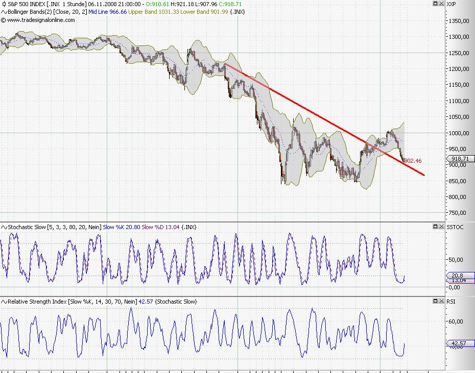 so, kurzfristiger abwärtstrend durchbrochen, MACD nun long und mit SK auf der TL, die die dabble tops verbindet. der handel morgen wird zeigen, obs ein trippel top wird, oder ob das ganze nach oben durchbrochen wird. das einzige, was mich noch für meine longs hoffen läßt, ist das penetrant fallende volumen. hier wird sich der markt die nächsten tage entscheiden müssen (und ich auch...).
