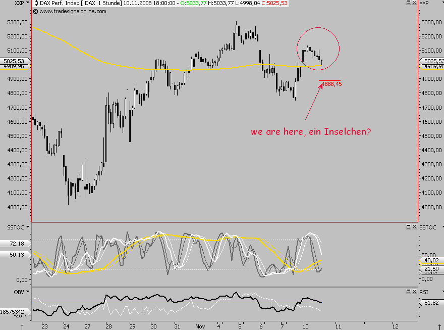 dafür, dass die umsätze so schwach sind (DAX wie BuFu), wundert es mich, das MAN/FRAU/MARKT den DAX so langsam abverkauft. hebt MAN/FRAU/MARKT sich den großen knall für die letzten minuten auf? die 5000 war offensichtlich keine nackenlinie, ansonsten hätte MAN/FRAU/MARKT vermutlich alles gekauft, was nicht bei 3 auf den bäumen ist. sieht für mich nicht sehr rosig aus, insbesondere weil die gewinne, die MAN/FRAU/MARKT bis eröffnung der US-Börsen gemacht hat (z.B. Öl, DAX, Euro etc) wieder komplett verschrottet sind. stellt sich die frage, welcher teil von MAN/FRAU/MARKT gewinnmitnahmen betrieben hat, und wie weit MAN/FRAU/MARKT noch mitnehmen will...