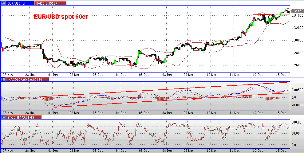 EUR/USD hat zu Wochenbeginn seinen rasanten Anstieg der vergangenen Woche fortgesetzt und ein neues Achtwochenhoch bei 1,3498 erreicht. Die charttechnischen Aussichten seien nach wie vor positiv, so dass Kursrücksetzer für den Aufbau neuer Longpositionen genutzt werden könnten, meinte ein Analyst, der als nächste Ziele die 1,3500 und die 1,3532 nannte. Über letzterer Marke böte sich auch ein Stoppkauf an, hieß es. An der Unterseite sollte die 1,3395, wo aktuell der seit Juli bestehende Abwärtstrend verläuft, nicht unterschritten werden. Gegen 10:15 Uhr UTC notiert EUR/USD bei 1,3470. (th/FXdirekt)