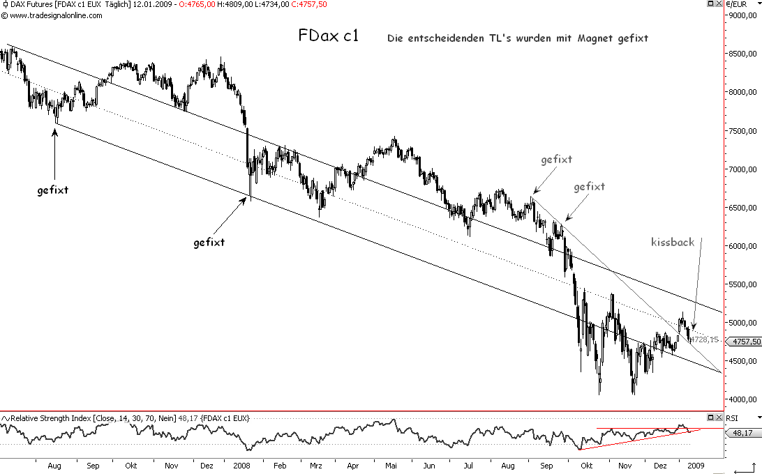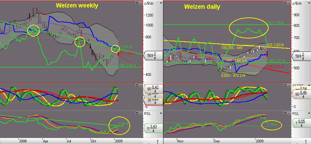 der weekly hat die korrektur schon seit einiger zeit angekündigt, upmove sauber am RSL und CCI abgeprallt. SK auf der TL, knapp unterhalb des 62er RT. mein erstes ziel wurde damit erreicht, und zwar in einem move (!), daher sofort die erste hälfte raus. der fallende EUR kam unterstützend dazu. luft nach unten gibt es in den indis erstmal reichlich, nur macht mich der widerstandscluster zw. 550 und 560 nicht ganz so optimistisch. morgen mal schauen, wie es läuft; geht weizen da durch, kann ich mir einen test der TL bei 49x vorstellen... long-versuch vielleicht wieder bei RSL 3.78/4?
