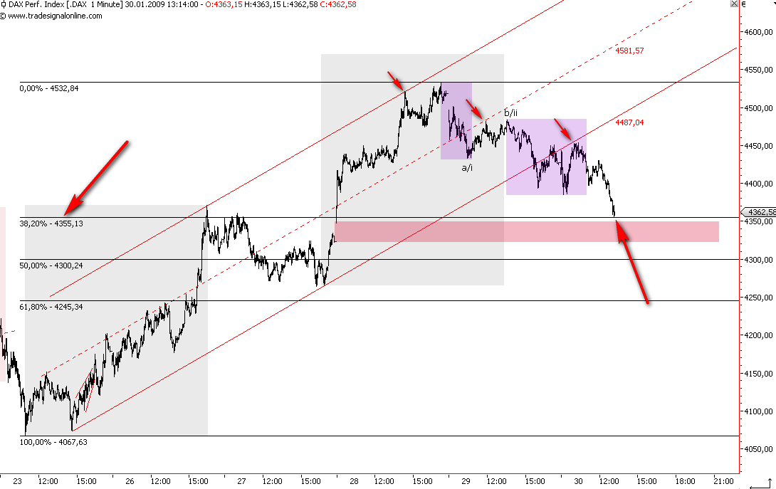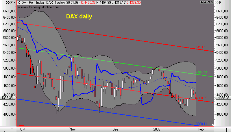 die forke bildet widerstände bzw supports. DAX ist "recht gut" an der forke abgeprallt. ich denke, momentan muss man sich überlegen, ob gerade noch eine 3er nach oben läuft (bei der wir dann gerade in der korrektur wären), oder ob wir noch in einem abwärtsimpuls sind, der an der 4070 korrigiert hat. wenn der DAX den vorgänger besser retracen würde, könnte ich mir gut ein durchbrechen durch die 4000 vorstellen. da er aber (zumindest heute) spürbar langsamer fällt, muss man (wie es AS schon vor ein paar seiten geschrieben hat) im hinterkopf behalten, dass es sich momentan um eine korrektur handeln könnte und das risiko möchte ich nicht übers WE eingehen.