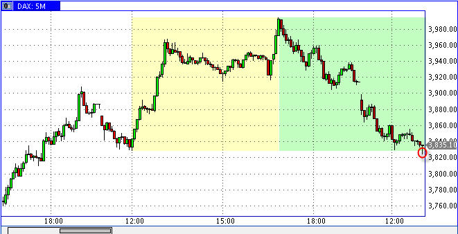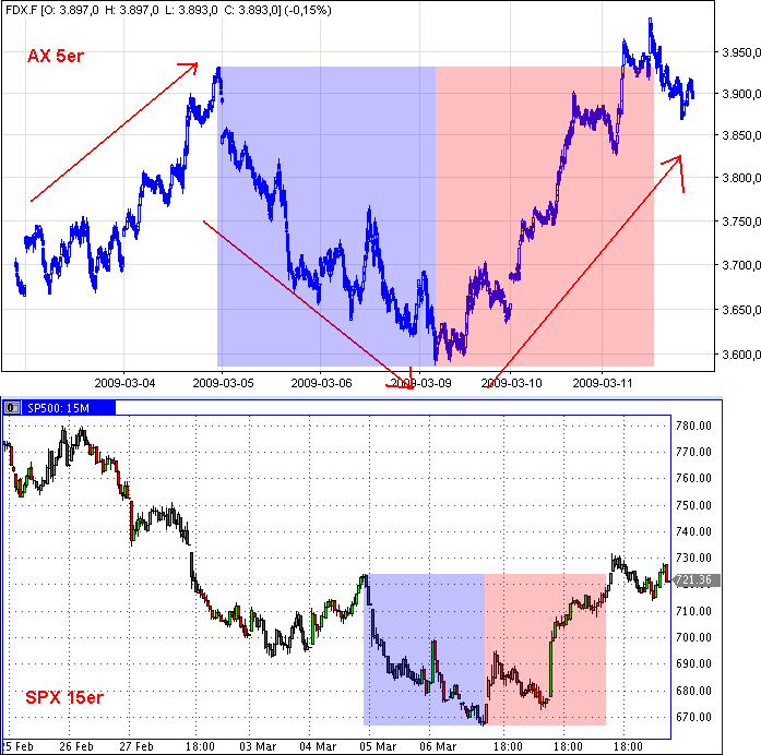 wenn man sich die charts ansieht, kann man meistens trends zwischen den zwischenhochs und -tiefs festmachen. man kann nun die dynamik (z.B.) eines abwärtstrends mit der darauf folgenden (z.B.) aufwärtswelle vergleichen, indem man zwei gleich große zeitboxen zeichnet und nebeneinander packt. das ist in den unteren abbildungen geschehen, und zwar eine zeitbox beginnend beim zwischenhoch am 5.3. und endend beim tief am 9.3. (blaue box). diese box "clont" man und packt sie direkt neben die erste.