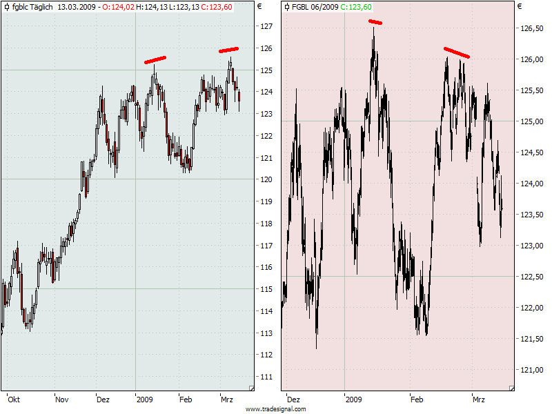 @fritz: von natur aus sind beide charts, die du zeigst, futures. wenn ich nicht irre, zeigt der linke aber den endlose-future, während der rechte den juni-kontrakt abbildet. da der endlos-future erst letzte woche auf den juni-kontrakt umgestellt wurde, erklärt sich, warum die chart unterschiedlich aussehen?