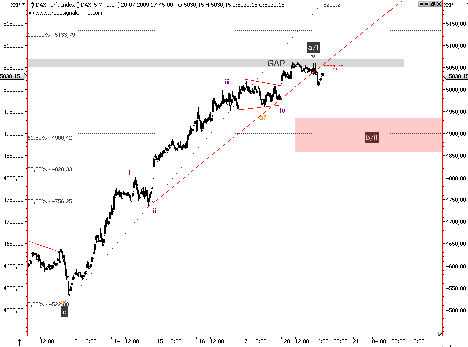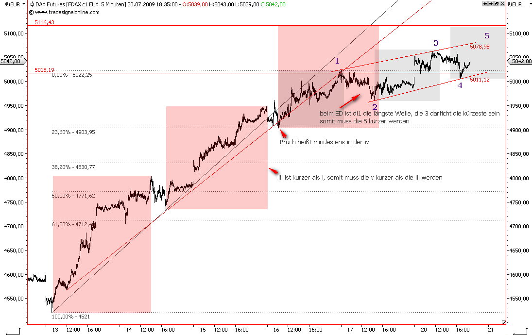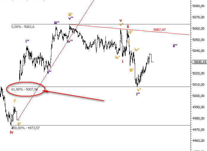 Das Problem ist doch aber, was es dann überhaupt für einen Sinn macht. Wenn ich jetzt sage, wir sind möglicherweise in der 5 der ending diagonal, aber das entscheidet sich erst, wenn es unter 5008 geht, dann frag ich mich, was für eine völlig neue Formation entsteht, wenn die 5008 nicht mehr durchbrochen wird. Sucht man sich dann einfach eine andere Formation mit den entsprechenden Wellen?