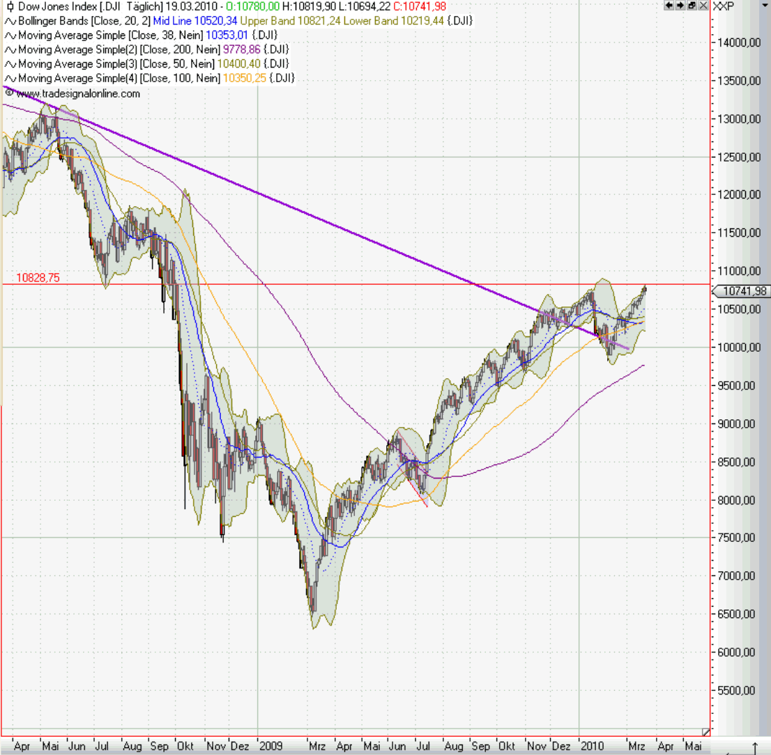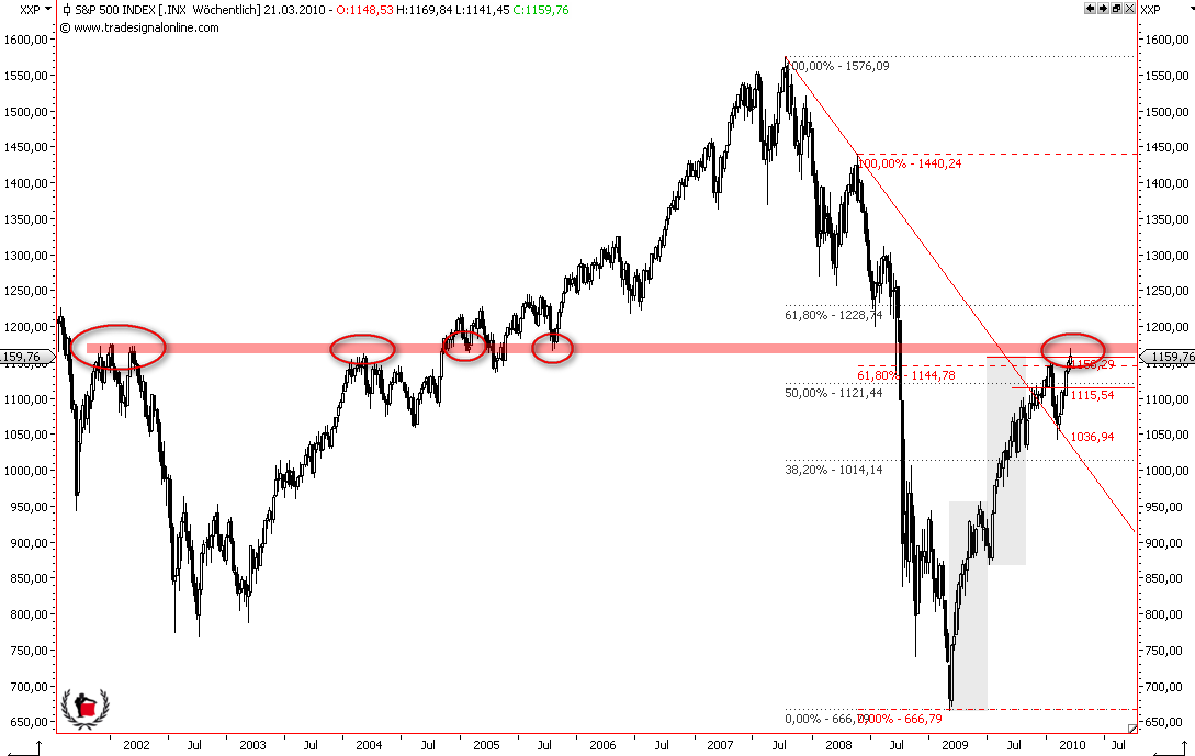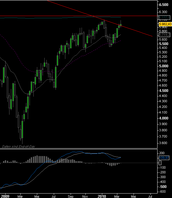 Börse (was Aktien betrifft) den Spruch, man solle eine Aktie kurzfristig nur halten, wenn man sie auch langfristig halten würde. Ich sehe das in Tradinghinsicht für den Dax ähnlich. Indikatoren in kurzfristiger Hinsicht können auch mal ein paar Tage länger überkauft sein, wenn der übergeordnete Trend aufwärts gerichtet ist, und dann konsolidiert beispielsweise der S&P erst bei 1200 runter auf 1160, anstatt jetzt mal die Überkauftheit abzubauen.