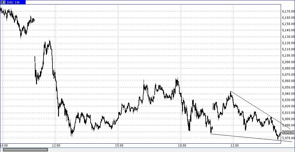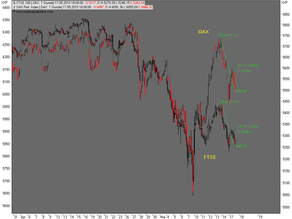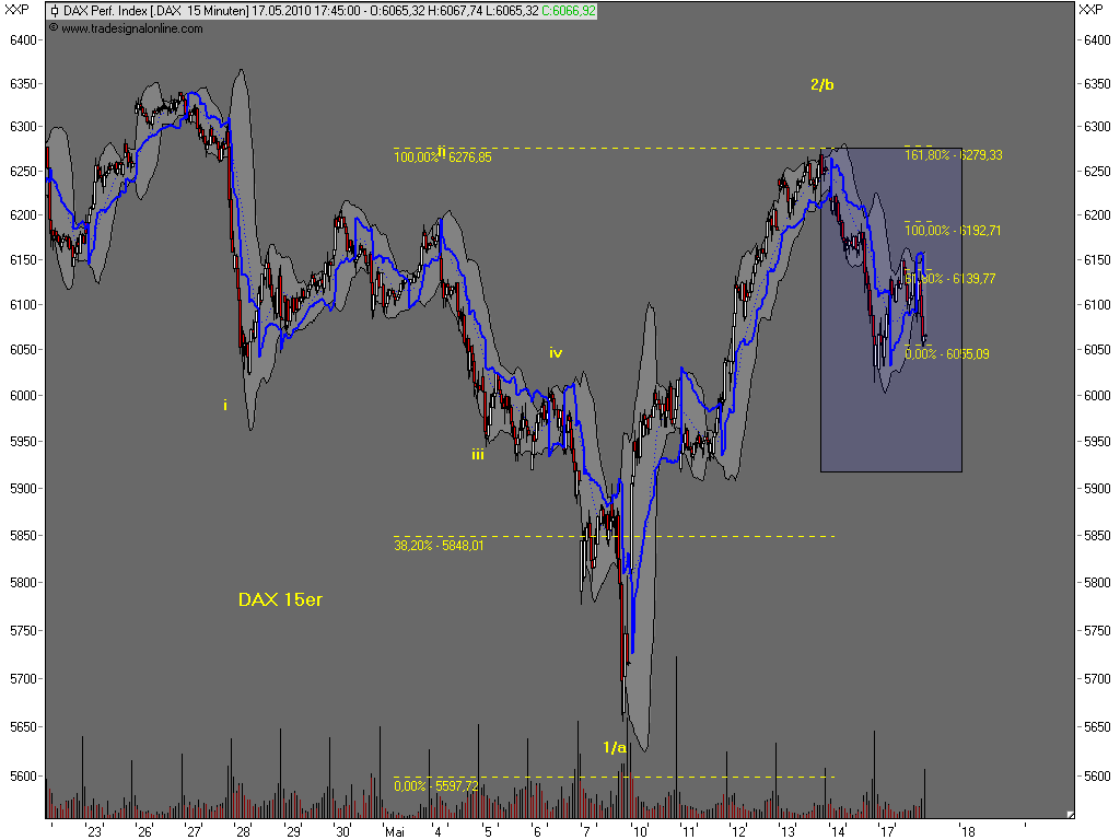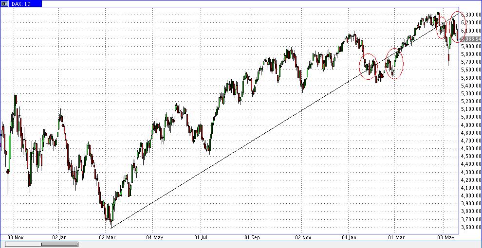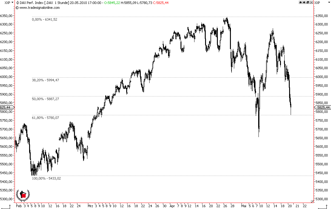 Bemerkenswert finde ich übrigens, dass die open interests für den Eurex-Verfallstag im Mai schon vor zwei Wochen auf ein Settlement zwischen 6000 bzw. 6050 und 6100 hingewiesen haben, eventuell auch rund 6100. Ich hätte wetten können, dass es hier noch deutliche Verschiebungen geben wird. Tatsächlich blieben die aber aus. Die open interests sehen noch genauso aus. Von daher ist das jetzt nur Verfalls-Geplänkel. Danach dürfte die übergeordnete Bewegung nach unten wieder aufgenommen werden. Ein Schließen des Gaps bei 5720 bis Ende Mai halte ich nicht für unwahrscheinlich. Anfang Juli könnte es sogar zu einem neuen Jahrestief bei 5300+-x kommen. Und danach ein letztes Mal stark nach oben mit neuem Jahreshoch.