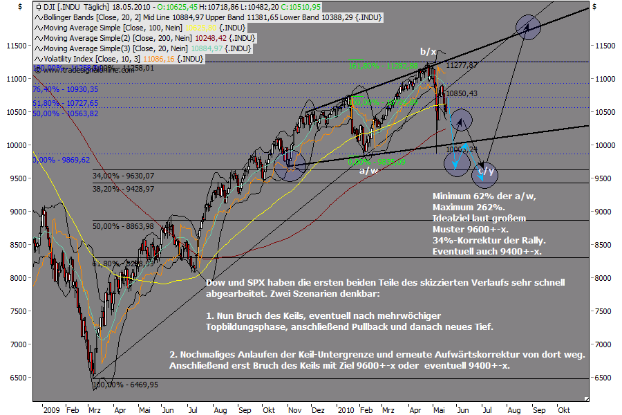 Die Sentiments kamen von wirklich extremen Niveaus und sind in der Zwischenzeit noch immer nicht bereinigt. Die Masse ist noch immer mindestens so optimistisch wie beim Januar-Hoch. Deshalb sollte die Abwärtskorrektur auch noch nicht beendet sein. Der SPX erreichte seine Keiluntergrenze bis auf wenige Punkte, der Dow durchstieß sie sogar kurzfristg. Es folgte der starke Rebound. Als nächstes sollten die jeweiligen Keile nach unten gebrochen werden. Ein mögliches bzw. wahrscheinliches Ziel für den Dow hierbei 9650+-x, eventuell sogar 9400 etwa. Zeitpunkt Anfang Juli, wobei auch die kommende Woche nach dem Mai-Verfall schon ziemlich bearish sein könnte. Dort unten sollten sich die Sentiments dann wieder in Stellung gebracht haben für den nächsten und wohl für einige Zeit letzten starken Rallyschub mit Ziel 11750+.