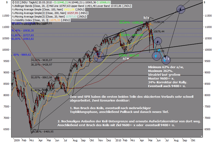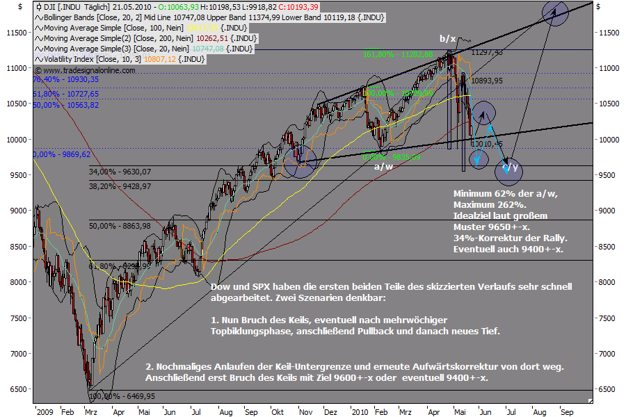"Abwärtsziel im Dow sehe ich zunächst bei der unteren Megaphon-Begrenzung. 10.000+-x. Kann sehr schnell gehen, innerhalb der nächsten beiden Wochen. Anfang Mai. Danach Erholung und anschließend vermutlich Bruch nach unten. Ab Anfang Juli wieder starke Rally mit neuen Hochs."