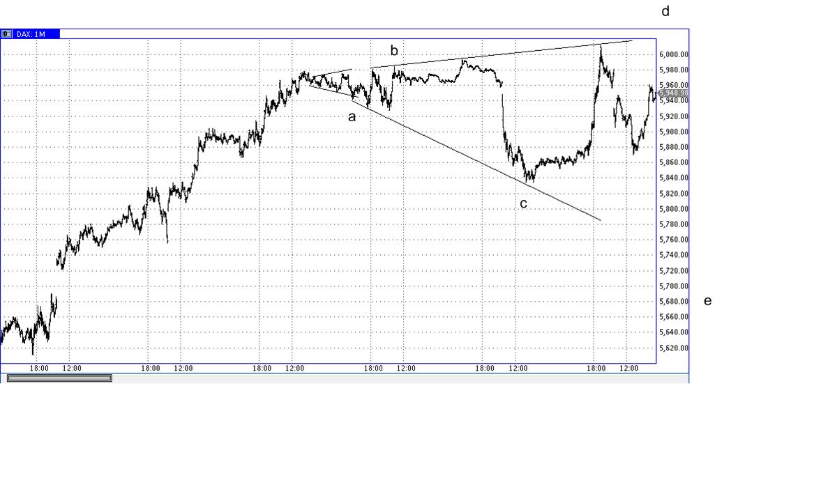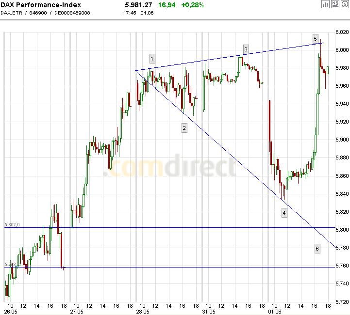 Von dort weg schnelle und starke Erholung in der Größenordnung von 50%-62%. Es wurden sogar 76%. Nach Ende des Rebounds Bruch des Keils mit vorläufigem Ziel 10650/750 etwa. Schau Dir mal den tatsächlichen Verlauf an bitte.