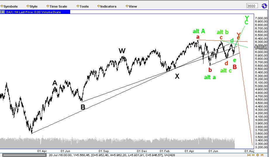 Weiß jetzt nicht genau, wann ich es geschrieben hatte hier. Anfang dieser Woche oder schon letzte Woche. Und auch gestern hatte ich ja auf Nachfrage von Katjuscha meine Sichtweise nochmals dargestellt. Ab Mitte Juli sollte eine Abwärtsbewegung starten, zumindest eine etwas größere Korrektur. Im Laufe des August ist dann ein Hoch zu erwarten. Es kann ein tieferes Hoch sein, falls es vorher schon ordentlich bröselt, aber auch ein neues Jahreshoch im Dax. Beides ist drin. Entscheidend: so oder so sollte der "große Short" erst im Laufe des August kommen. Denn selbst wenn es nur ein tieferes Hoch wird, dann dürfte der Großteil der Abwärtsbewegung trotzdem erst vor uns liegen bis in den Oktober hinein. So hatte ich es jetzt zwei mal erklärt.