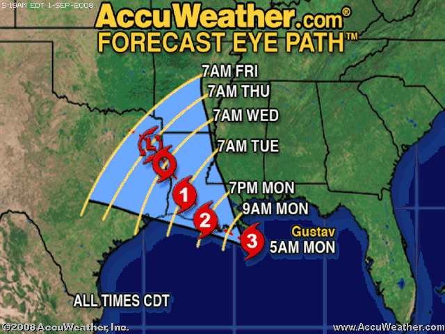 Although Louisiana is bracing for the worst effects from Gustav, residents from the upper Texas coast to the western Florida Panhandle should pay close attention for any shifts in the track of Gustav. Once inland, Gustav is expected to slow significantly (Das machen alle Hurrikane über Land - A.L.]. This could cause major flooding on Tuesday and Wednesday across inland Louisiana and northeast and parts of eastern Texas.