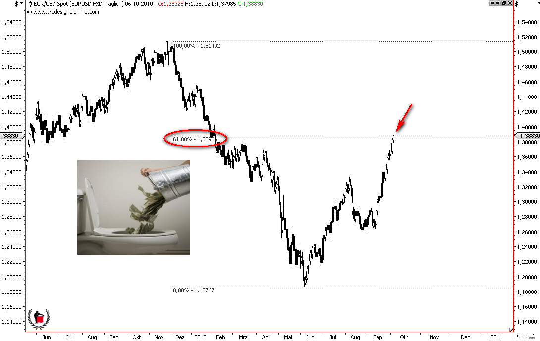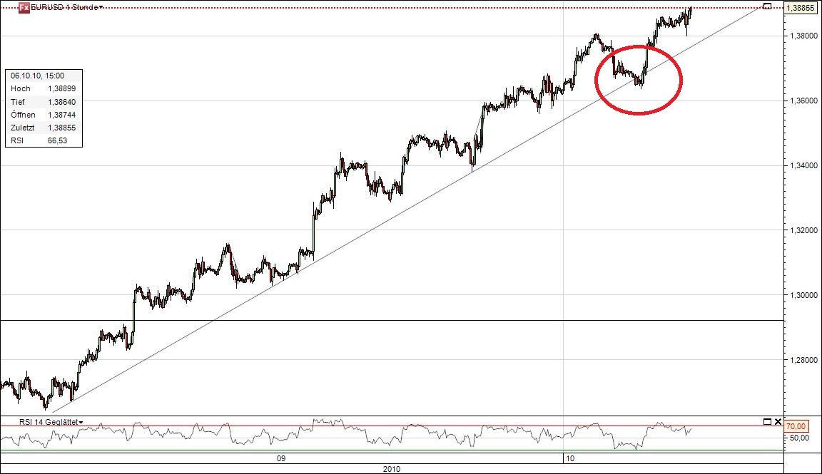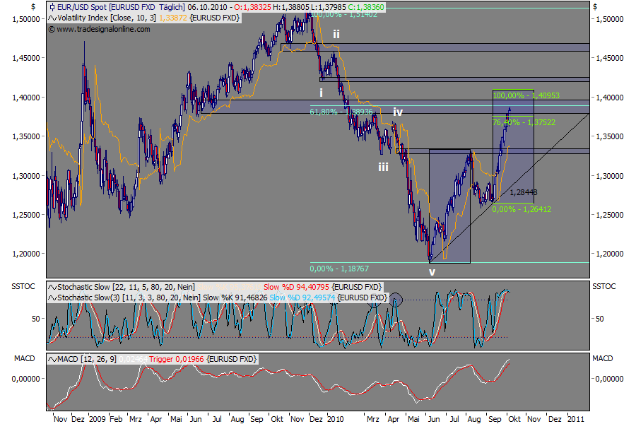 Die Zählung wird wohl falsch sein, aber Grundaussage ist, dass ich mir nun wieder eine deutliche Abwärtsbewegung im Euro erwarte. Vielleicht kann er noch auf 1,41 vorher. Allerdings hat er bereits genügend negative Divergenzen im hourly.