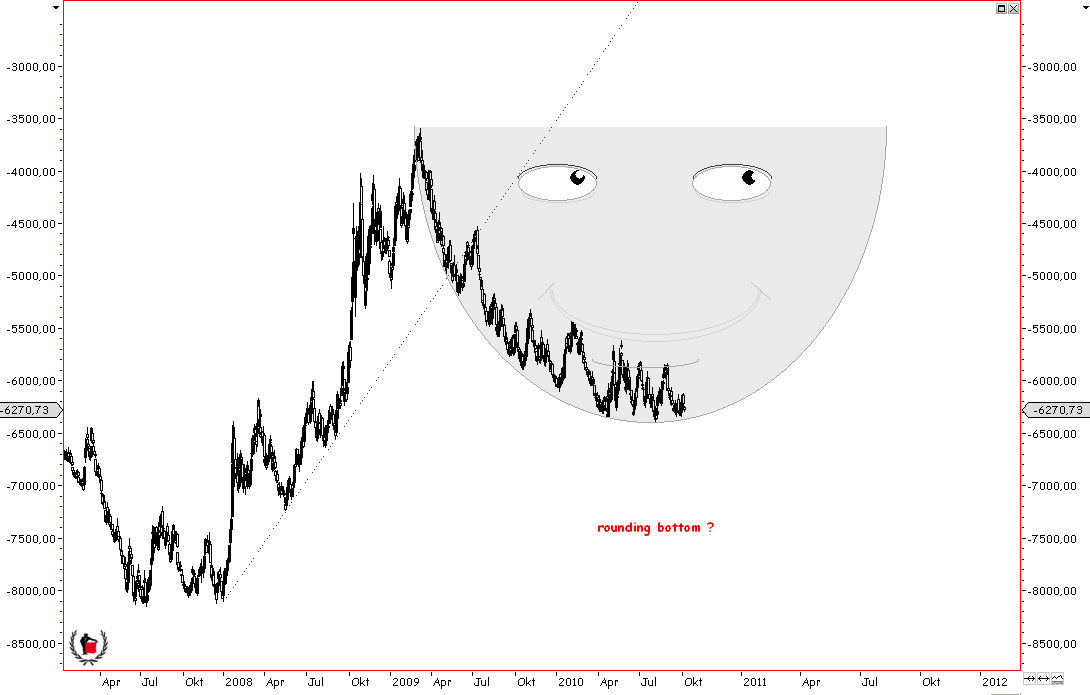 zum übergeordneten Sentiment. Das Rydex Nova/Ursa Ratio gibt Platz auf beiden Seiten, genau wie Investors Intelligence. Der SMA 20 des Equity-PCR´s notiert bei 0,59. Beim April-Hoch stand es deutlich tiefer, unter 0,5. Ist ein Kontraindikator, wie die meisten Sentiments, klar. Allerdings war der April-Wert ein absoltes Extrem. Der übliche Wendebereich liegt bei ca. 0,57 - 0,65. Hier werden gerne markante Tiefs im PCR-Durchschnitt und dementsprechend Hochs in den Aktienindizes gebildet. In diesem Bereich drehte es z.B. im Januar und April 2010, Juni 2009, Mai 2008 und sogar im Oktober 2007. Ein solcher PCR-Durchschnitt war regelmäßig für mindestens 10% nach unten gut bei Dow und SPX. Spannend wird´s mit Blick auf das Nasdaq-Sentiment in Verbindung mit den entsprechenden COT-Daten. Eine extreme Spitze im Sentiment. Ähnliche, nicht ganz so hohe, sahen wir nur drei Mal in den letzten acht Jahren. Weiter reicht der Chart nicht zurück. April 2010, Mai / Juni 2008 und im vierten Quartal 2007. Ein klarer Kontraindikator also. Mit Blick auf diese Vergleichssituationen muss man demnächst mit 15-20% nach unten rechnen beim NDX bzw. Compx. Aufgrund dieses Sentiments, bestätigt durch die COT-Daten herrscht also Crash-Gefahr für die Nasdaq, nicht allerdings für Dow und SPX. Ich vermute, NDX und Dax werden in der kommenden Abwärtsbewegung stärker verlieren.