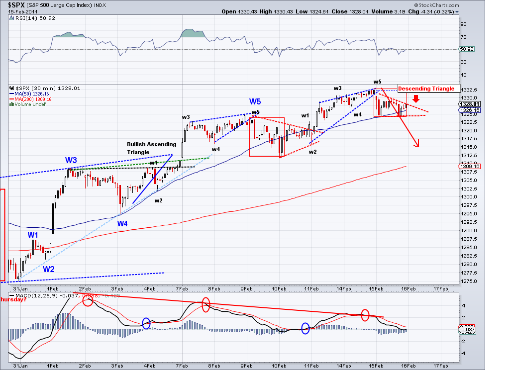 hab nicht überprüft ob die trends genau passen, allerdings passt es gut zu EW analysen und überkaufte indikatoren, negativen divergenzen, einem höchststand im $BPSPX und ev bearish wegde im spx.