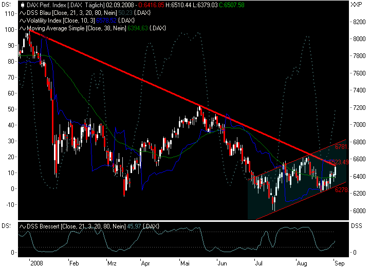 Für eine Erholung des Sektors spricht außerdem der deutliche Rückgang der Rohstoffpreise, insbesondere bei Rohöl, der den Unternehmen eine höhere Margenentwicklung ermöglicht. Die Industrie hat nämlich im Zuge der Rohstoffhausseim ersten Halbjahr deutliche Preiserhöhungen gegenüber ihren Kunden durchsetzen können, die durch die jüngste Verbilligung der Rohstoffkosten einen zusätzlich positiven Effekt auf die Gewinnentwicklung haben werden. Im Chart des DAXSec.Chemicals fällt darüber hinaus auf, dass sich die Volatilität, die sogenannte Schwankungsbreite, erheblich verringert hat. Das ist ein deutliches Signal für eine bevorstehende Ausbruchsbewegung.