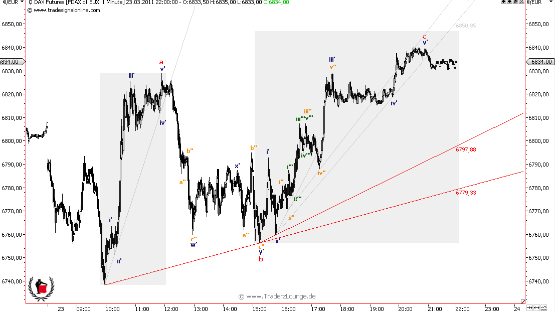 gibt, die graue hat sich durchgesetzt, eine c ist vom Tisch bzw. die c war der Abschluss des ersten Flats als w, diese Variante wurde aber en detail nur im geschlossenen Bereich besprochen, im übrigen wurde ein mögliches höheres Retracement im letzten Daxupdate ausführlich ausgeführt, wenn man sich die Mühe gemacht hatte es zu lesen (0-2 TL)