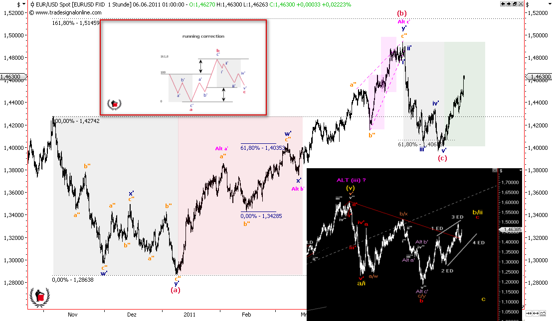 präferierte ich bislang ein ED in der c of b/ii im big Picture (schwarz), es kann aber auch eine running correction gewesen sein. der laufende Impuls? seit 1,4019 (im ganz kleinen Bild, nicht abgebildet bzw. gelabelt) kann fertig gezählt werden, allerdings wurde die 0-2 TL nicht gebrochen, als wxy (any three pattern) ist es auch zu zählen, in diesem Fall wäre eine ED 4 in der b, eine running correction (expandet flat) wäre unschön, weil es keine direkte 0-2 TL gäbe, aber ein Schönheitspreis ist im Blütenkrieg sicherlich nicht zu gewinnen