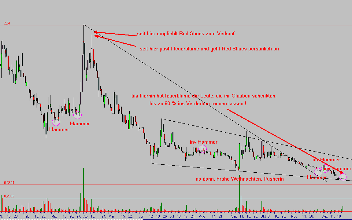 die Aktie ist nach seiner Verkaufsempfehlung nur noch 20 % wert, d.h. wer auf den Feuerpuller reingefallen ist, muß 450 % machen, um sich sein Geld wiederzuholen, so einfach ist das und diese freche, dreiste Person traut sich auch noch in die Öffentlichkeit, ich möchte nicht wissen, wieviele arme Schlucker an Weihnachten dasitzen und keine Geschenke kaufen können, weil sie auf die dreisten Sprüche vom Feuerpuller reingefallen sind, das kann man schon fast als arglistige Täuschung betrachten, was heißt eigentlich fast