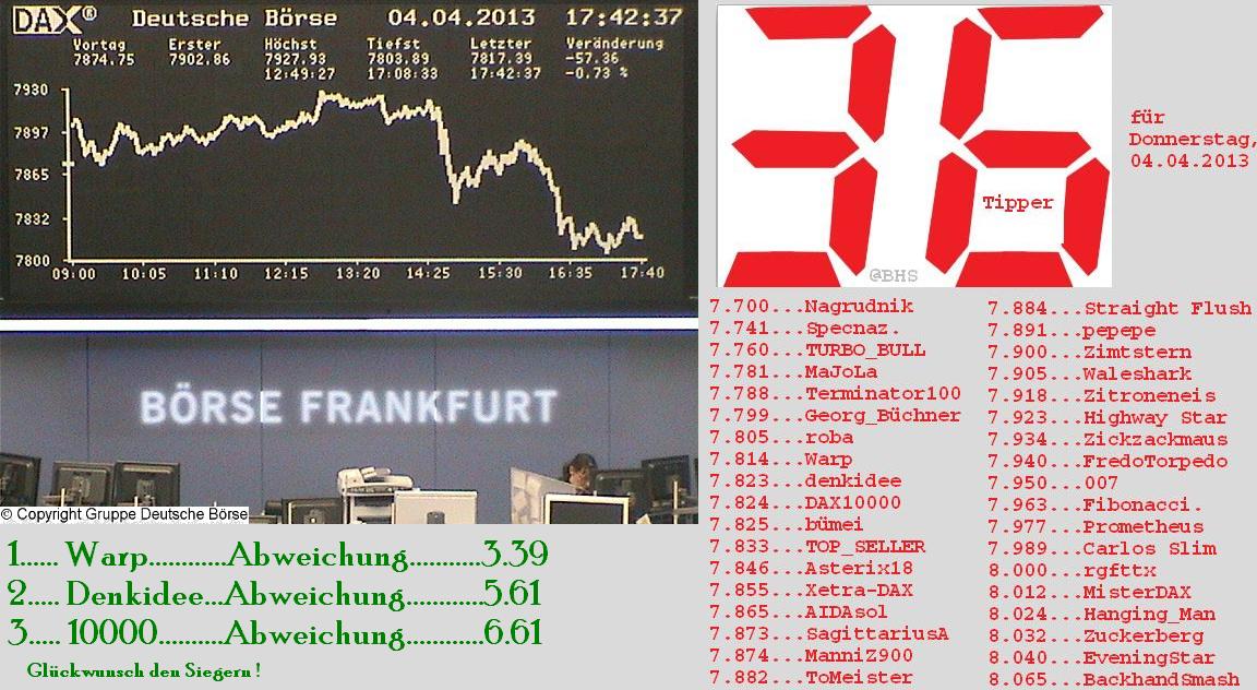 Gewinnerlinks 2.031. DAX Tipp-Spiel, Donnerstag , 04.04.2013, 17.45 Uhr, DAX 7817,39