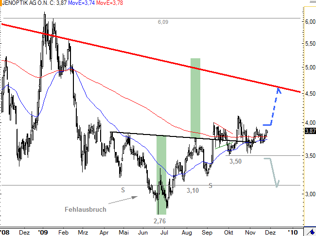 Können sich die Käufer jedoch nicht durchsetzen und die Aktie fällt nachhaltig unter 3,50 Euro zurück, wäre mit einer Verkaufswelle bis auf 3,10 Euro und darunter dann 2,76 Euro zu rechnen.