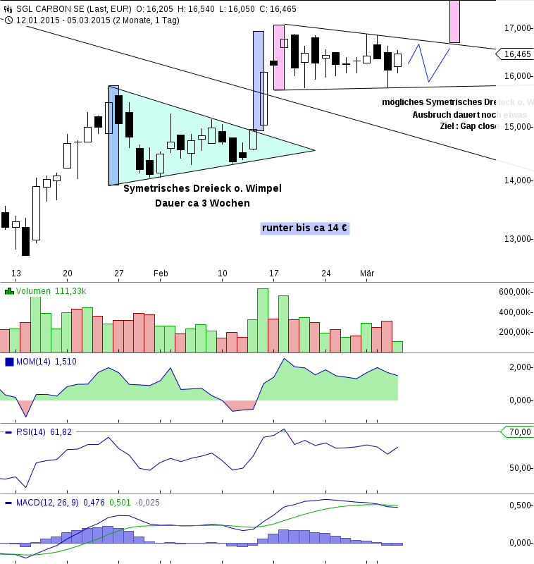 Im Oktober 2014 fiel die Aktie von SGL Carbon auf ein Tief bei 12,00 Euro ab und schwenkte danach in eine Seitwärtsbewegung ein. Diese spielte sich zwischen 12,00 und 15,45 Euro ab. Am 16. Februar 2014 brach der Wert aus dieser Seitwärtsbewegung nach oben aus. Nach einem Hoch bei 17,05 Euro konsolidierte die Aktie allerdings zuletzt wieder etwas. Heute drückt SGL Carbon aber gegen den kurzfristigen Abwärtstrend bei 16,75 Euro.