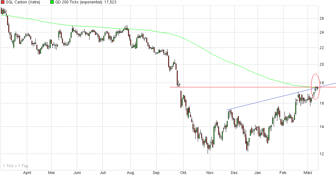Mit Verlaub, aber ein wenig Bauchweh habe ich bei eurer Diskussion hier. Das SGL-Carbon vom Chartbild her seit Jahresbeginn inzwischen von jedem auch nur mäßig intelligenten Trader als "perfekter Turnarround Chart" da steht und empfohlen wird, ist unumstritten. Der Chart ist die perfekte Basis. Jedoch ist das nichts als Wunschdenken. Mal ganz abgesehen davon, dass an der Börse nie das passiert, was alle bzw die Mehrheit erwartet, denn dann wäre da kein Cent Geld zu verdienen ;) Die einen geben, die anderen nehmen...nie vergessen!
