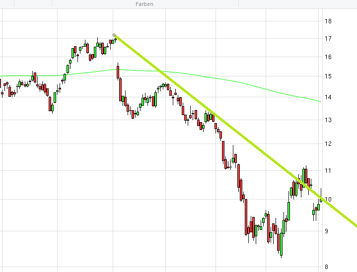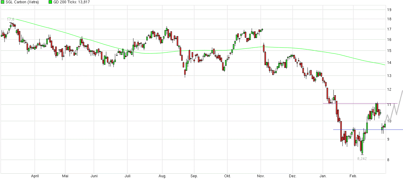 Der SGL Chart entwickelt sich wie erwartet: schulbuchmäßig folgte dem Test des Widerstands bei 11,- Euro der Rebound zurück auf die Ausbruchslinie bei 9,65 Euro. Von dort aus hangelt sich der Kurs seit zwei Tagen wieder vorsichtig nach oben.