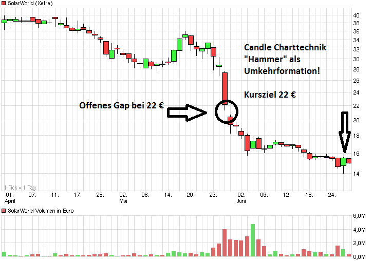 Vor der Hoffnung auf Schließung eines Gaps, das bei 22 liegt, wie sie hier von unseren Superoptimisten gestern in allen Threads verbreitet wurde, kann bei Solarworld auch nur gewarnt werden. Wenn es die Zusammenlegung der alten und der jungen Aktien nicht gegeben hätte, könnte man charttechnisch gesehen, diese Hoffnung haben. In die Zusammenlegung sind aber nur ein verschwindend geringfügiger Anteil an alten Aktien eingeflossen. Nach der Zusammenlegung gab es damit eine ganz neue Aktie, die in erster Linie aus Aktien bestand, deren Kursverlauf zwischen 19,50 im Hoch und 12,65 im Tief lag. Das sollte man bei der Charttechnik, die ansonsten durchaus eine Berechtigung hat und für Anlageentscheidungen herangezogen werden sollte, bei dem Chart von Solarworld berücksichtigen. Allein die Tatsache, dass der Kurs der zusammengelegten Aktien sich bislang nur in dem Bereich des Kurses der davor jungen Aktien bewegt, und nicht in dem Kursbereich der alten Aktien, sollte zum Nachdenken anregen.
