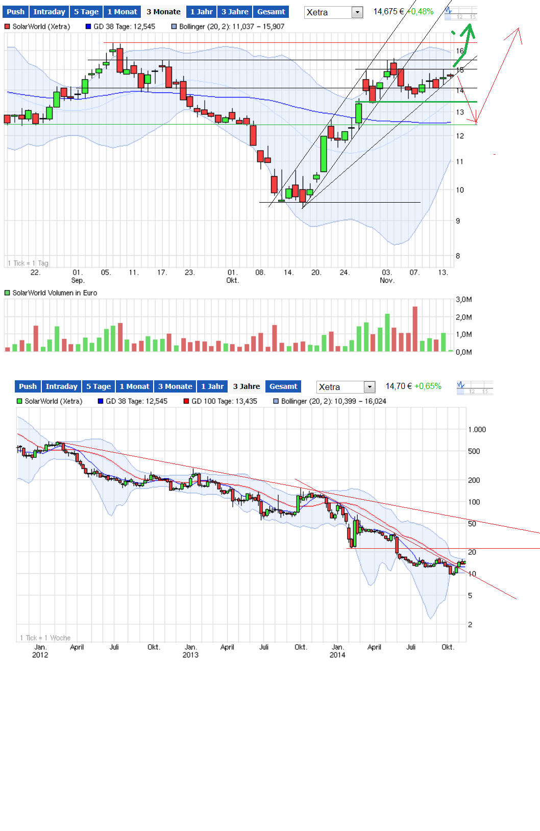 Zieht man mal die Sondereffekte beim Q3-EBIT ab (+ 5,8 Mio. € durch Verminderung der Wertberichtigung eines Polysiliziumvertrages - ursprünglich bei 36,1 Mio. € - aufgrund von Wechselkurseffekten gg. Q2/ - 8 Mio. € Anlaufkosten Boschproduktion), dann wäre das Q3-EBIT ohnehin nur noch bei Minus 2 Mio. € gelegen anstatt der ausgewiesenen 4 Mio. €. Dazu dann noch der hohe Auftragsbestand von 350 MW und das relative hohe Working Capital von 177 Mio. €, dann braucht man eigentlich kein großer Wahrsager zu sein, dass Solarworld ihren richtig guten Q3 Absatz von 270 MW bzw. Q3-Umsatz von 180 Mio. € in Q4 noch toppen wird (Septemberabsatz bei 100 MW !).
