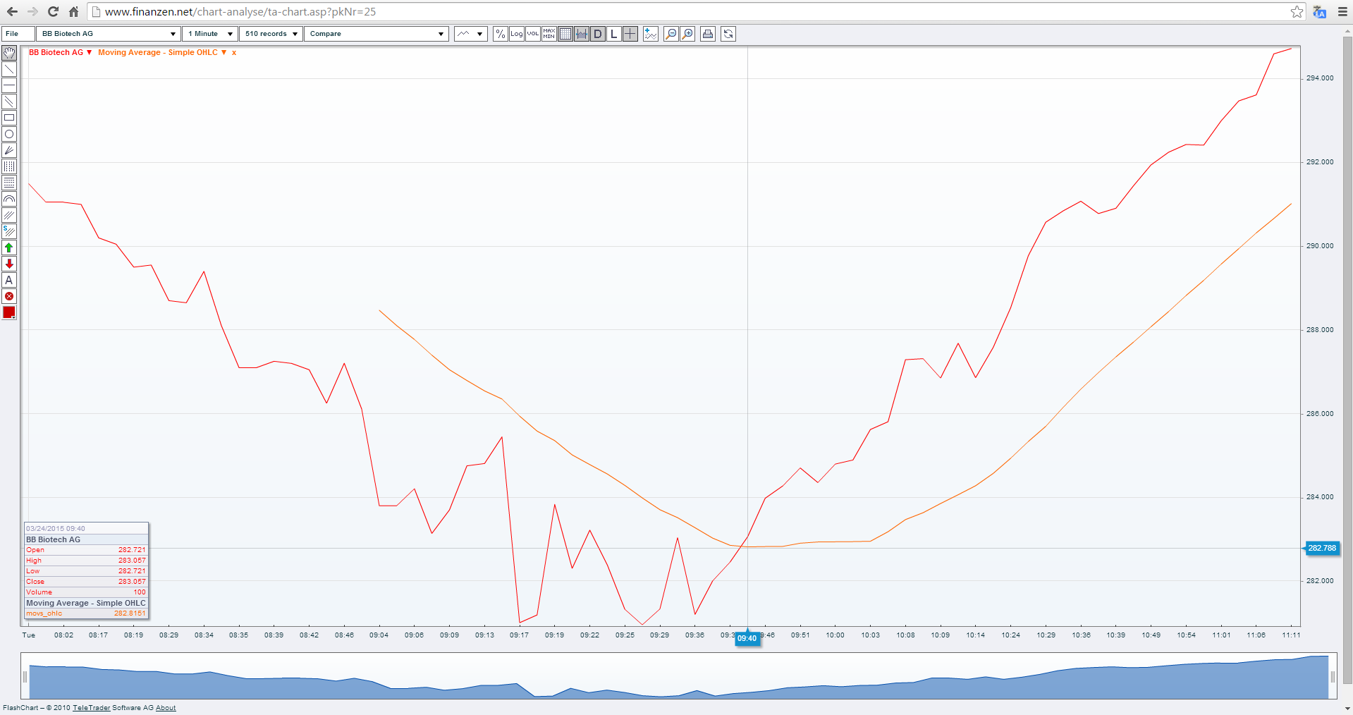 Das könnte beispielsweise ein MACD beantworten, aktuelles Signal auch unter http://www.finanzen.net/chartsignale/aktien/BB_Biotech/Signal-6510498 zu sehen. Aktuell haben wir technisch gesehen einen Trend nach unten, also "Short".