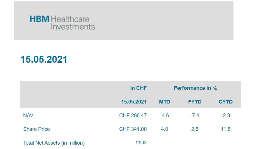 "HBM Healthcare Investments investiert im Sektor Gesundheit. Die Gesellschaft hält und bewirtschaftet ein internationales Portfolio erfolgversprechender Unternehmen in den Bereichen Humanmedizin, Biotechnologie, Medizinaltechnik und Diagnostik sowie verwandten Gebieten. Die Hauptprodukte vieler dieser Unternehmen sind in fortgeschrittener Entwicklung oder bereits am Markt eingeführt. Die Portfoliounternehmen werden eng begleitet und in ihrer strategischen Ausrichtung aktiv unterstützt. HBM Healthcare Investments ist dadurch eine interessante Anlagealternative zu Investitionen in grosse Pharma- und Biotechnologieunternehmen. HBM Healthcare Investments wird von einem internationalen Aktionariat getragen und ist an der SIX Swiss Exchange kotiert."