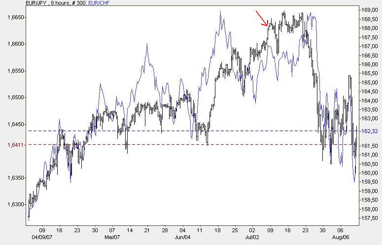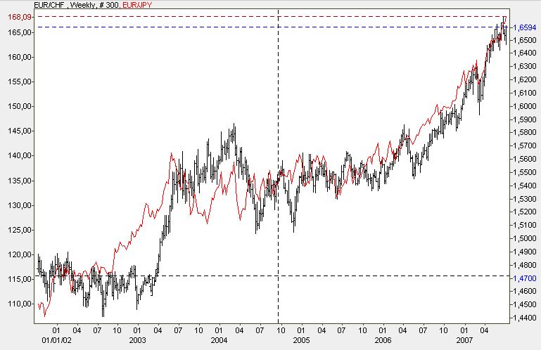 Bei EUR/JPY hatten Viele bereits 160 als das Ende der Fahnenstange angesehen, nun haben wir schon 168 (ATH). Beim Franken schien 1,65 bereits "billig", nun haben wir 1,66 (zwischenzeitlich sogar 1,67). Das Fatale ist, dass Carry-Trader - solange alles gut läuft - doppelt belohnt werden: Zum einen sacken sie die Zinsdifferenz ein, zum anderen machen sie Kursgewinne, weil Späteinsteiger die Verschuldungswährungen noch weiter in den Keller drücken. Dies ist freilich ein Schneeballprinzip, bei dem die Letzten die Hunde beißen.