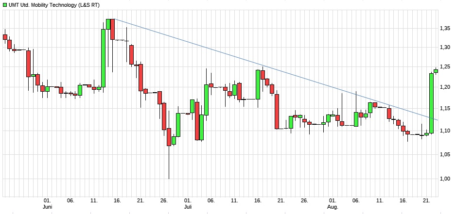 23.08.2018 (www.4investors.de) - Gestern konnte die Aktie von UMT United Mobility Technology deutliche Kursgewinne verzeichnen, die von auffälligen Umsätzen in dem Papier begleitet wurden. Charttechnisch bringt dies die Aktie in eine interessante Ausgangslage. Auf Schlusskursbasis kletterte der Aktienkurs am Mittwoch um 11,76 Prozent auf 1,235 Euro, das Tageshoch wurde bei 1,24 Euro notiert. Da aktuelle Indikationen am Donnerstagmorgen das Niveau knapp bestätigen, bleibt für die UMT United Mobility Technology Aktie eine wichtige charttechnische Hürdenzone in Reichweite.