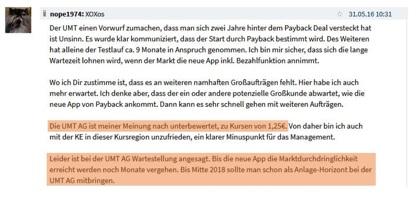 SWM Treuhand AG bzw. dessen auch langjähriger UMT Aufsichtsrat und Wirtschaftsprüfer Roderich Schätze im Namen geschädigter Anleger auch langsam mal Klage gegen die UMT AG einreichen? Oder zunächst mit der Stimmenmacht eine außerordentliche Hauptversammlung einberufen und Aufklärung über die tatsächlichen Verhältnisse einfordern? Zu Peaches Mobile. Ob Payback die UMT-Technologie langfristig betrachtet für'n Appel und Ei übernommen hat, die man über viele Jahre mit zweistelligem Millionenaufwand entwickelt hat.