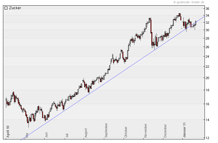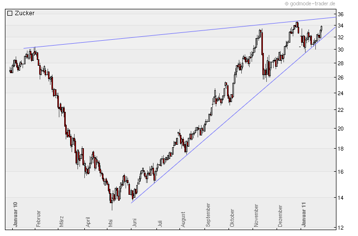 Der Kursverlauf von Zucker war im vergangenen Jahr geprägt von einer heftigen Berg- und Talfahrt, wobei die Bullen zuletzt das bessere Ende für sich hatten. Denn nach dem deutlichen Preisanstieg der Vorjahre folgte Anfang 2010 ausgehend vom Jahreshoch bei 30,40 US - Cent ein massiver Einbruch, der Zucker über die Hälfte seines Kurswertes kostete und mit dem Unterschreiten der wichtigen Unterstützungszone bei 19,73 - 19,88 US - Cent (das Hoch aus dem Jahr 2006) zusätzlich an Fahrt gewann. Erst an der aus dem langfristigen Aufwärtstrend und einer zuvor gebrochenen Abwärtstriggerline bestehenden Kreuzunterstützung bei 13,55 US - Cent wurde die Talfahrt gestoppt und ohne Umschweife in einen dynamischen Anstieg umgewandelt.