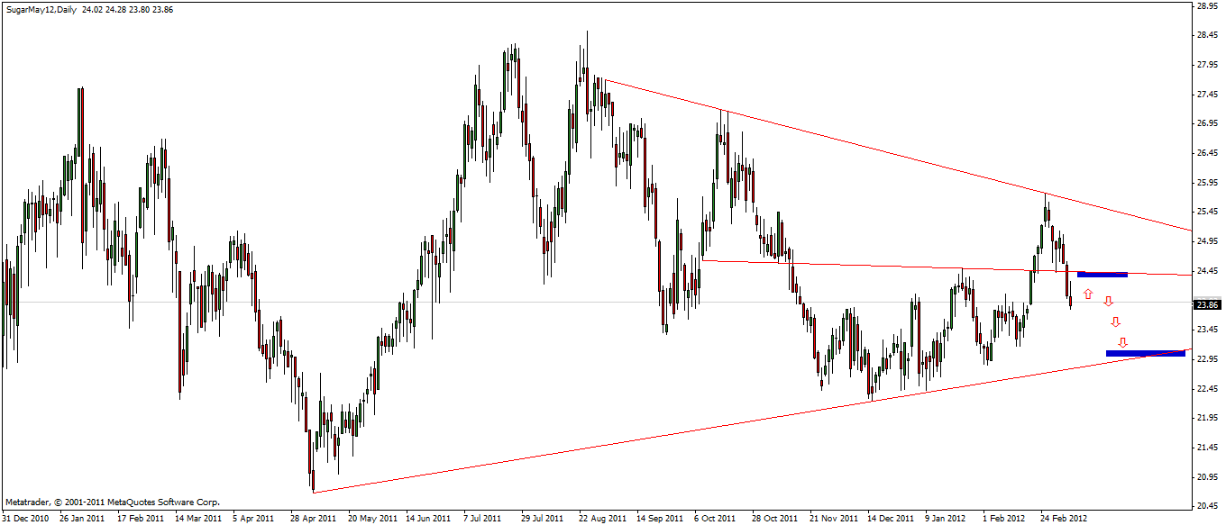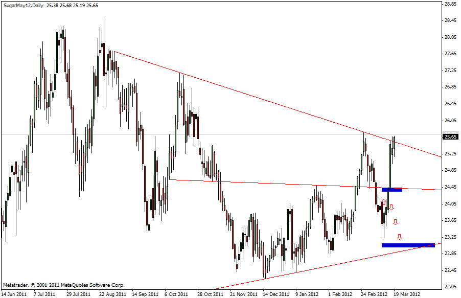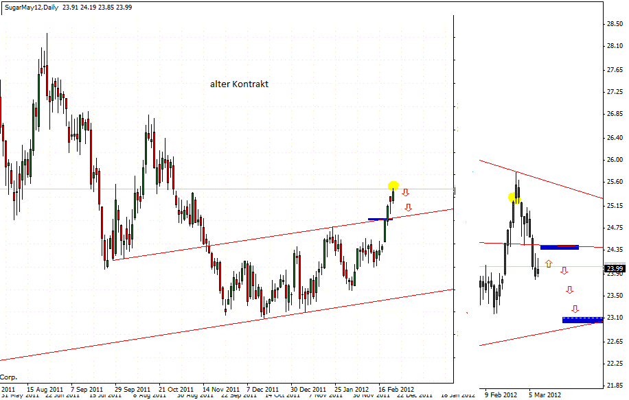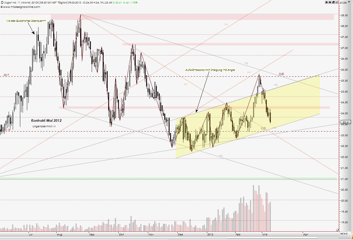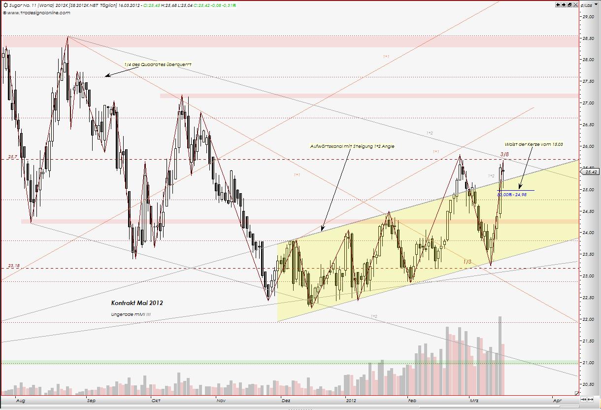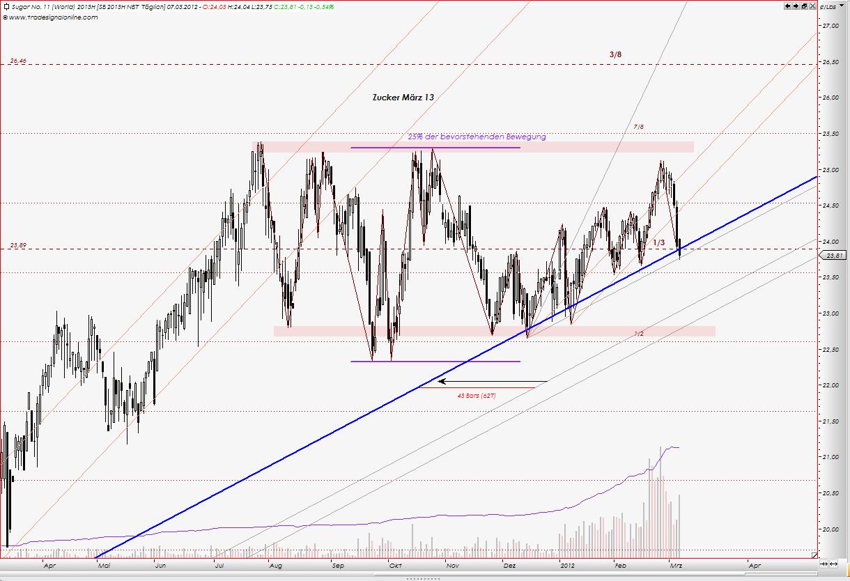 Nach meiner Interpretation, hat der Zuckerpreis einen Boden gebildet und ist aus der Schiebezone nach oben ausgebrochen. Korrekturen sind in Ordnung. So lange der Preis nicht unter 22,80 fällt, dürfte er stetig steigen trotz der Nachricht, dass in diesem Jahr 7,5 Millionen Tonnen Angebotsüberschuss anfallen werden.