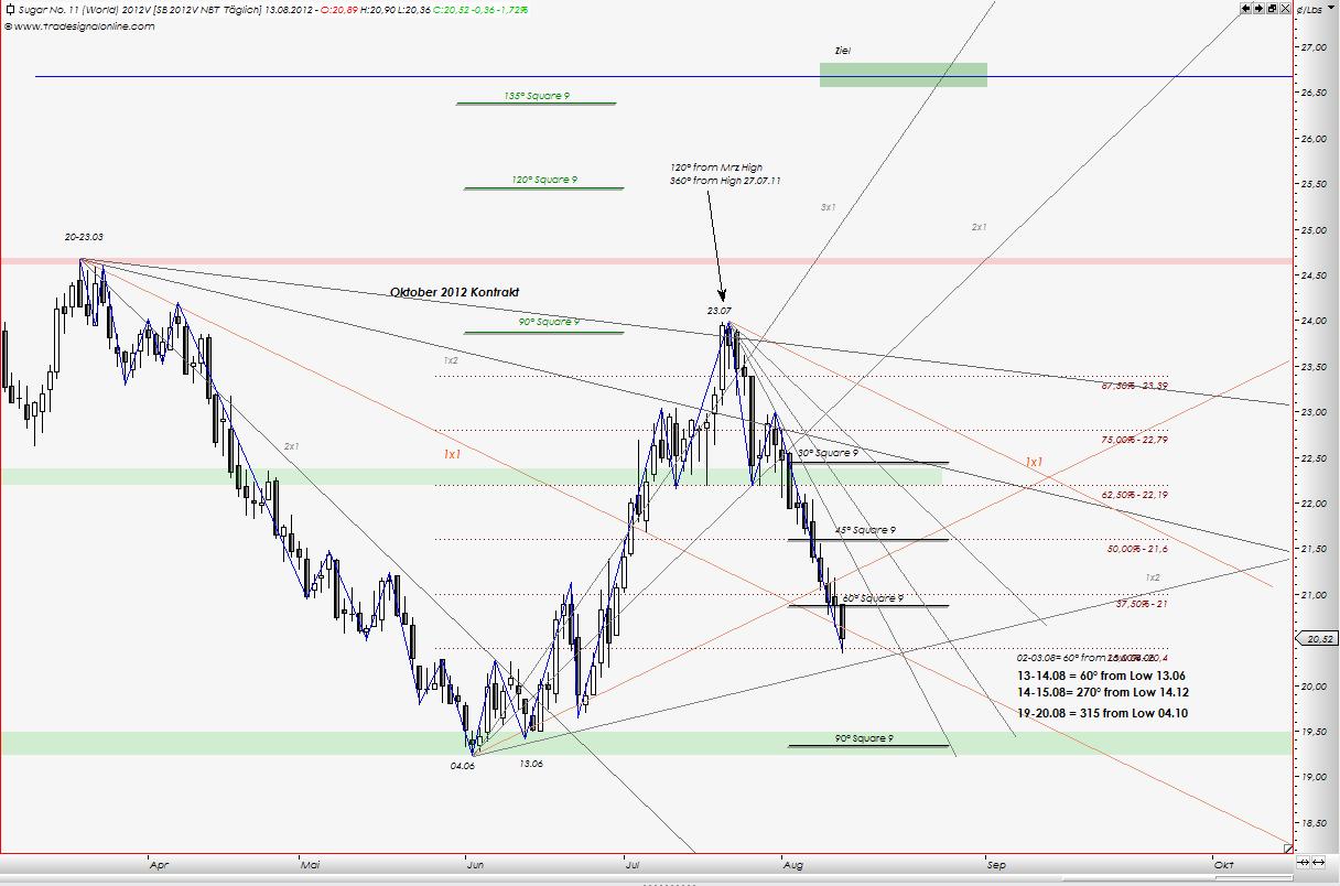 Etwas problematisch ist die Tatsache, dass die 1x1 Winkellinie gebrochen wurde, was ja bedeutet, dass die nächste, darunterliegende, erreicht werden soll. Nach meiner Beobachtung trifft das nicht immer zu. Es ist wichtig, dass in den nächsten Tagen Preis wieder über diese Linie aufwärts geht. Darüberhinaus ist es wichtig, dass 60° Winkellinie aus Square of nine nicht mit Schlusskurs nach unten bricht, weil in diesem Fall liegt die nächste, 90° Winkellinie, bei den Tiefs von Juni.
