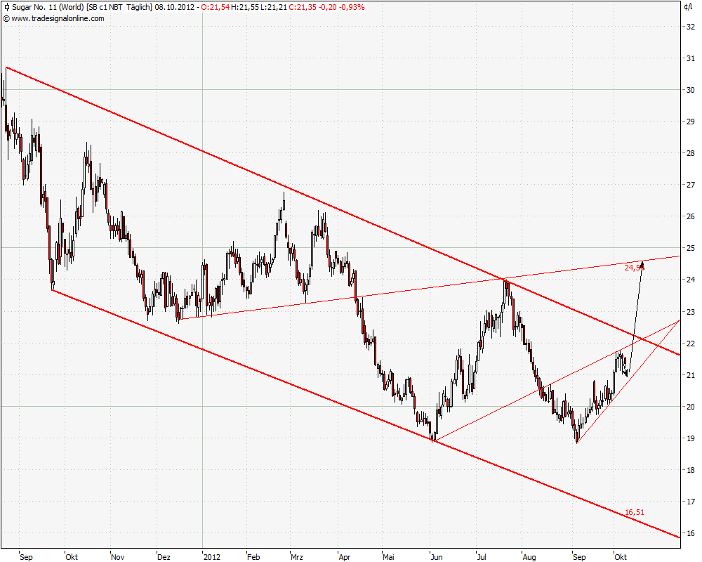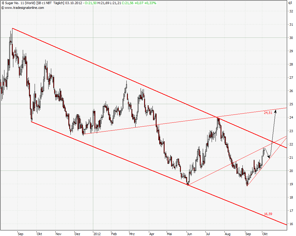 Der Produktionskostenpreis für Zucker liegt gegenwärtig ungefähr bei 19 Cent. Die Hersteller werden das nicht lange mitmachen, keine Gewinne mehr zu erziehlen und die Produktion wieder drosseln. Zudem hat der hohe Zuckerpreis in den letzten Jahren auch dazu geführt, dass mit Krediten in die Zuckerproduktion investiert wurde. Diese Kredite können nicht dauerhaft bedient werden, wenn der Zuckerpreis sich nicht erholt. Also auch dort droht Produktionsseitig eine Konsolidierung. Und nicht zuletzt, beim jetzigen Preis lohnt es Zucker in Ethanol zu wandeln. Es kann gut sein, dass der Preis noch weiter fällt, wenn Zucker zu Dumpingpreisen auf den Markt geworfen wird, weil Kredite bedient werden müssen etc. Aber mittel- und langfristig wird der Zuckerpreis wieder steigen, insbesondere wenn andere Agrarrohstoffe wieder anziehen, die ebenfalls gebeutelt sind - denn dann werden die Anbauflächen wieder anderweitig genutzt. Bedenke einfach, dass die genannten Entwicklungen auch mal mit einer schlechten Ernte zusammengehen können.Und nicht zuletzt, der Markt ist überverkauft, wer wollte da bei 19 Cent schon noch short gehen?