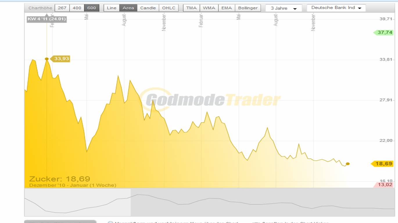 Die Chattechnik hat aber einen einen gewisssen "self fulfilling prophecy" Effekt, weil einige Investoren den vermeintlichen "Signalen" hinterherlaufen. Wer sich beim Zucker an der Chartechnik orientiert und nicht an den fundamentalen Entwicklungen, wird daher immer etwas hinterherhächeln und nur auf bereits fahrende Züge aufspringen.