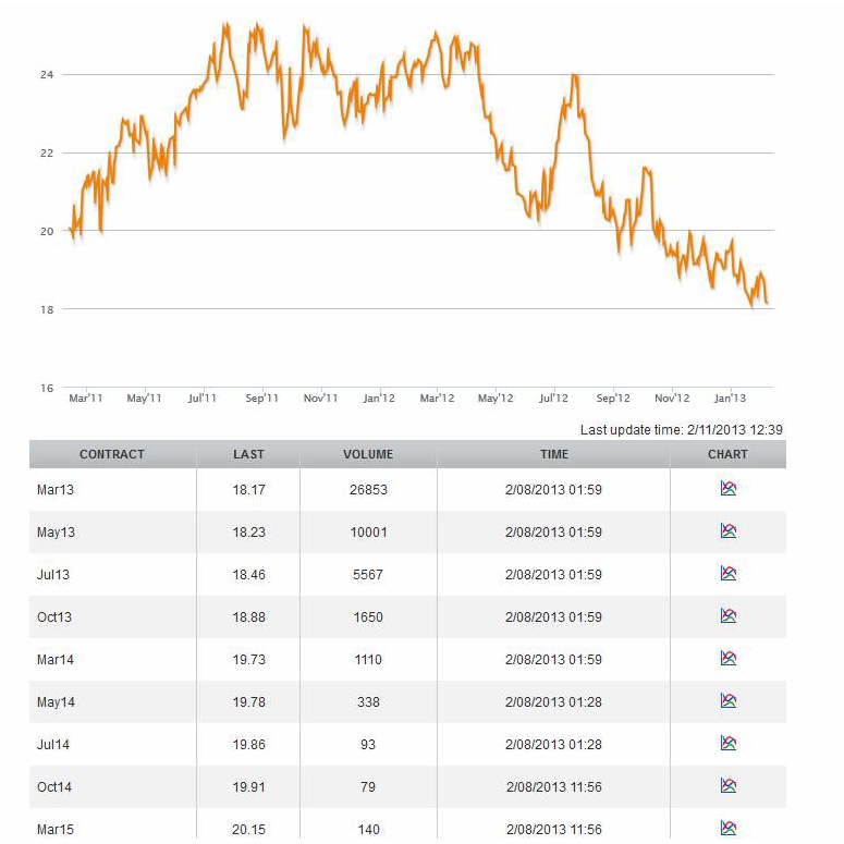Hier ein aktueller Chart, die Preise für die nächsten Kontrakte und die Volumina derselbigen. Wie ich die Sache sehe, sollte der zuckerpreis nicht unter 18 ct. fallen, würde mich aber nicht wundern, wenn er das zeitweilig tut. Ich bin auch der Meinung, dass wir langsam aber sicher einen relativen Boden bei Zucker sehen.