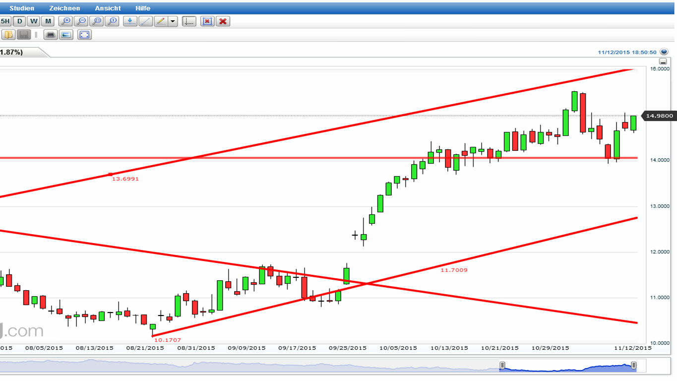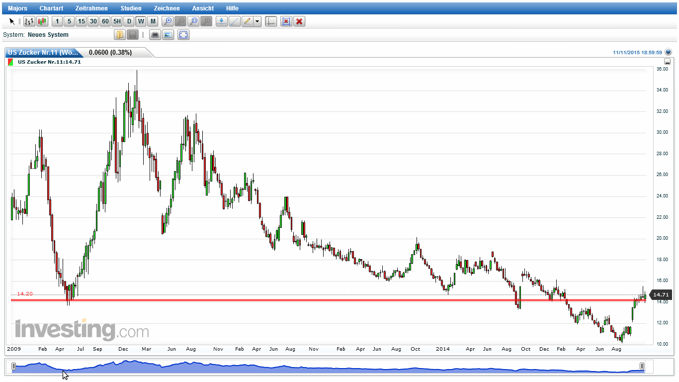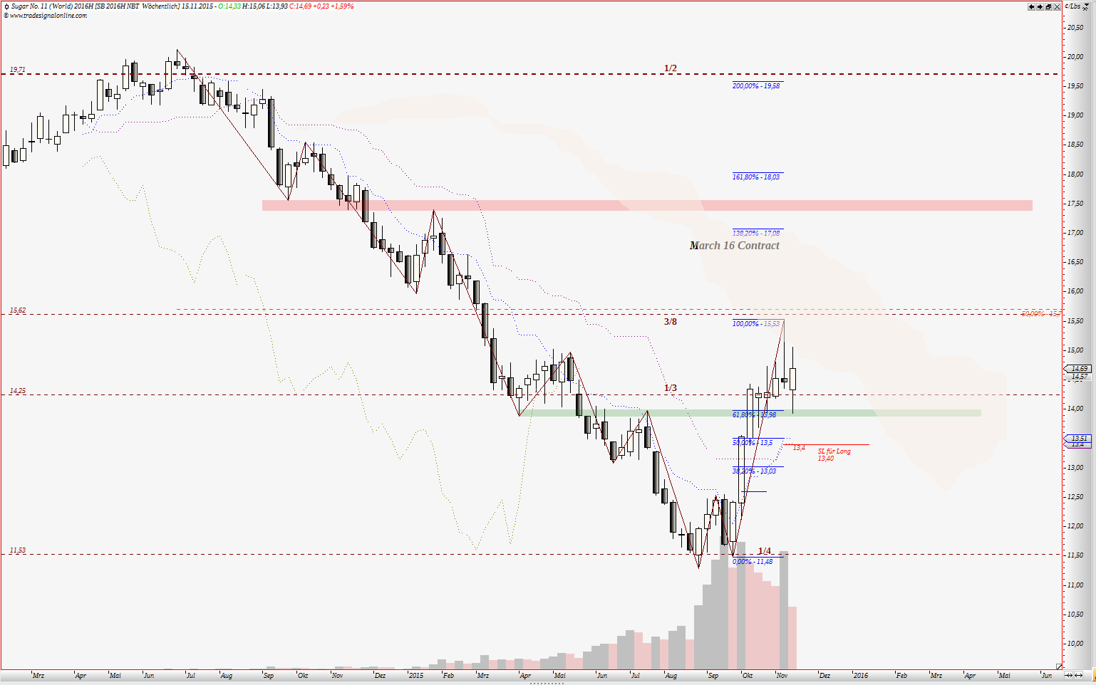 wiederhollen, wenn ich noch mal auf meine Einschätzung der Lage eingehe. Daher nur kurz. "Bei Zucker, März 2016 Kontrakt erwies sich Bereich um 13,80-14,00 US Cent (Tief vom März 2015 – Hoch 14.07.2015), bis jetzt als feste Unterstützung. In den nächste Tagen, Wochen wird sich zeigen ob Zuckerpreis den Aufwärtstrend wieder aufnehmen kann." Quelle: