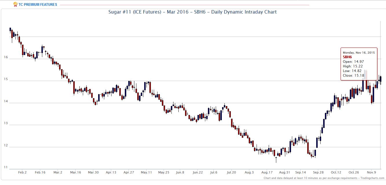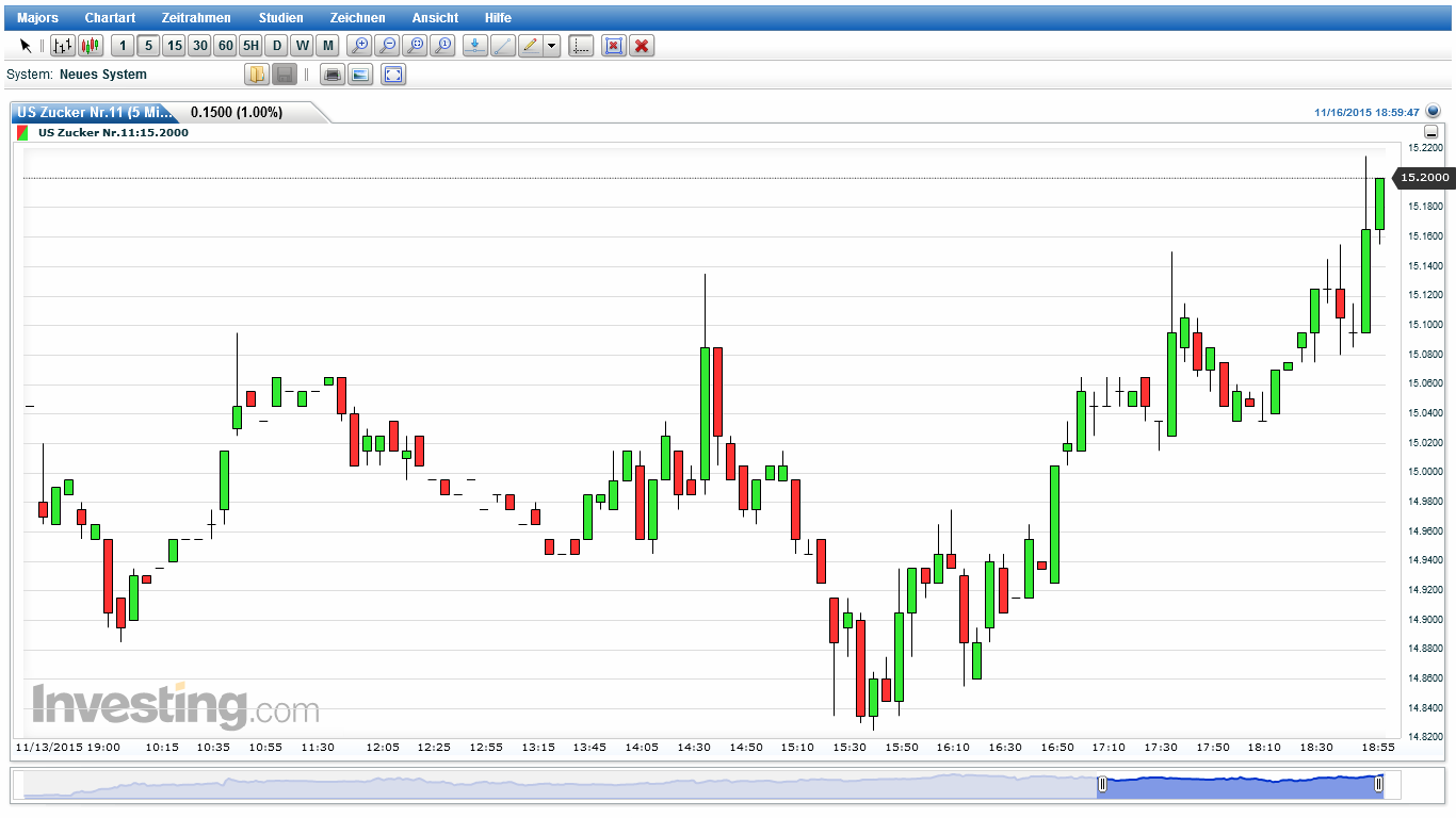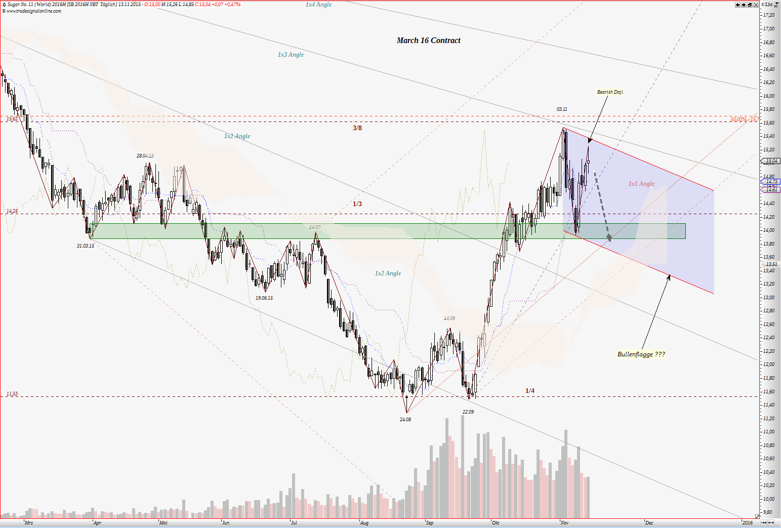wiederhollen, wenn ich noch mal auf meine Einschätzung der Lage eingehe. Daher nur kurz. "Bei Zucker, März 2016 Kontrakt erwies sich Bereich um 13,80-14,00 US Cent (Tief vom März 2015 – Hoch 14.07.2015), bis jetzt als feste Unterstützung. In den nächste Tagen, Wochen wird sich zeigen ob Zuckerpreis den Aufwärtstrend wieder aufnehmen kann." Quelle: