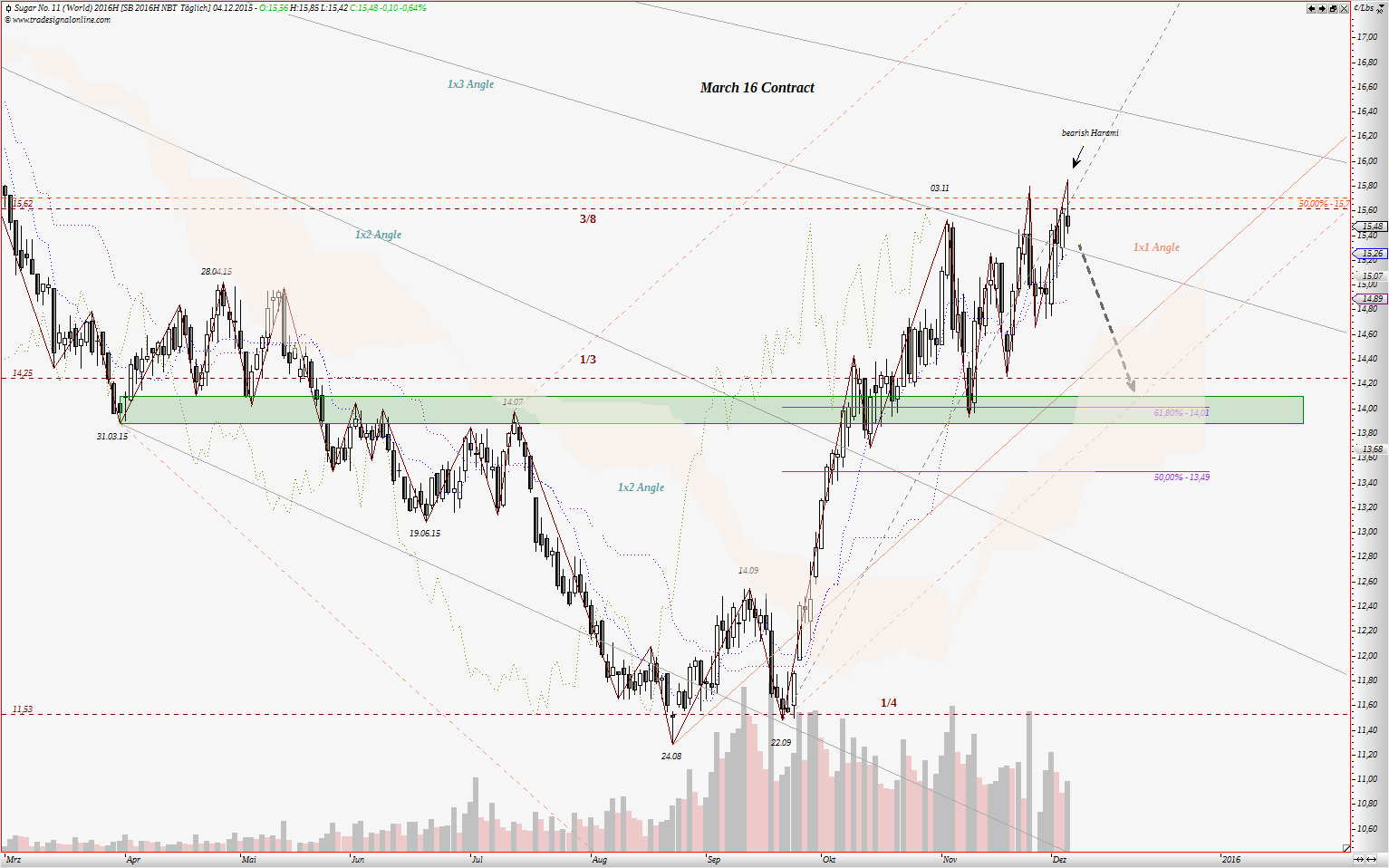 Das Problem bei Zucker März 2016 Kontrakt besteht darin, dass 24.08 und 29.09 ergeben Doppelboden und man weiß noch nicht genau aus welchem Boden die wichtige Angle henaus geht. Gann empfall in so einem Fall aus beiden Tiefs Linien zeichnen und warten bis eine der beiden bestätigt wird.