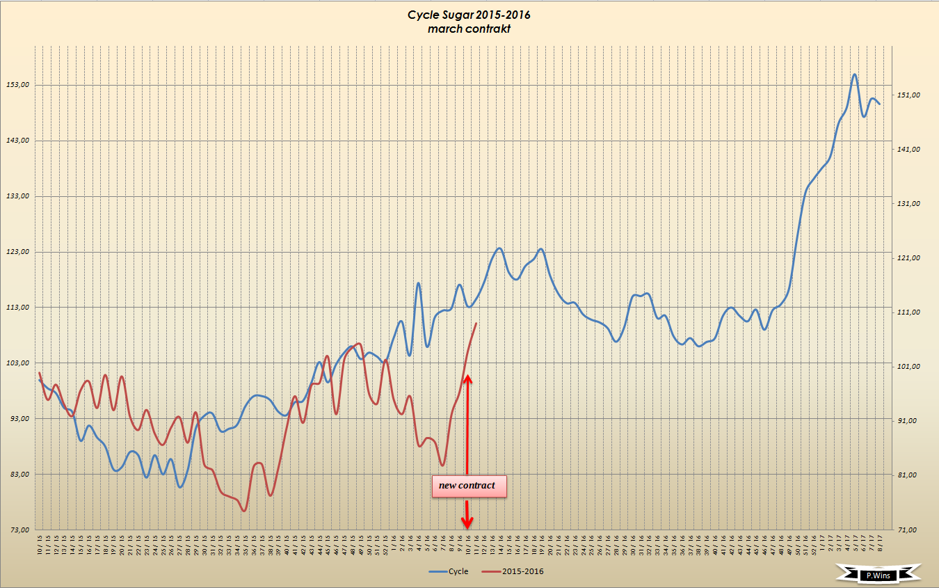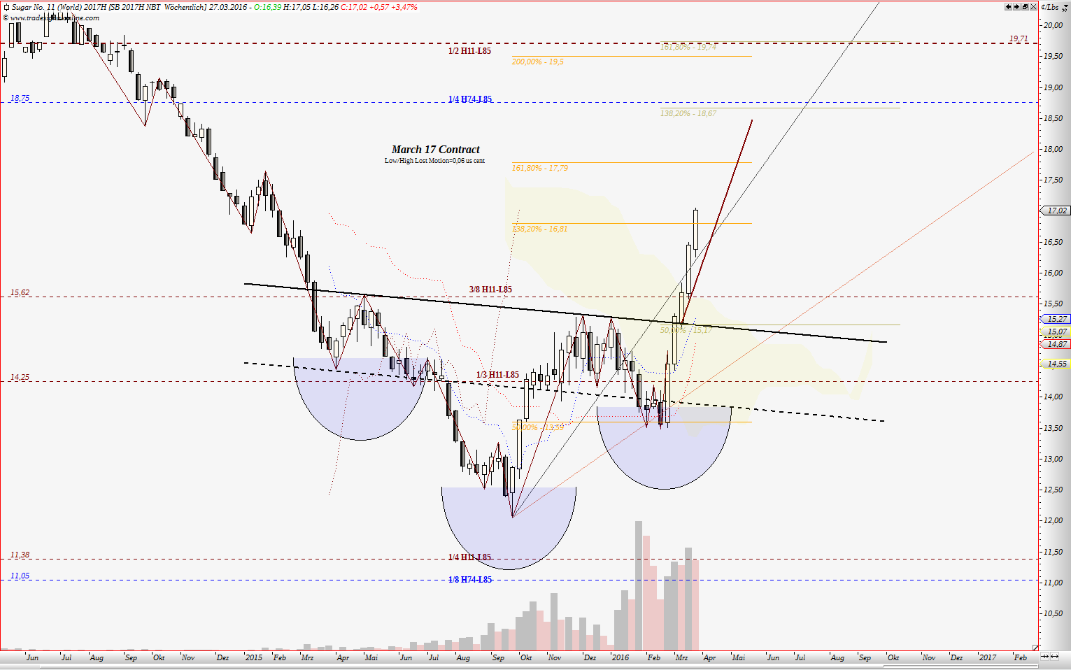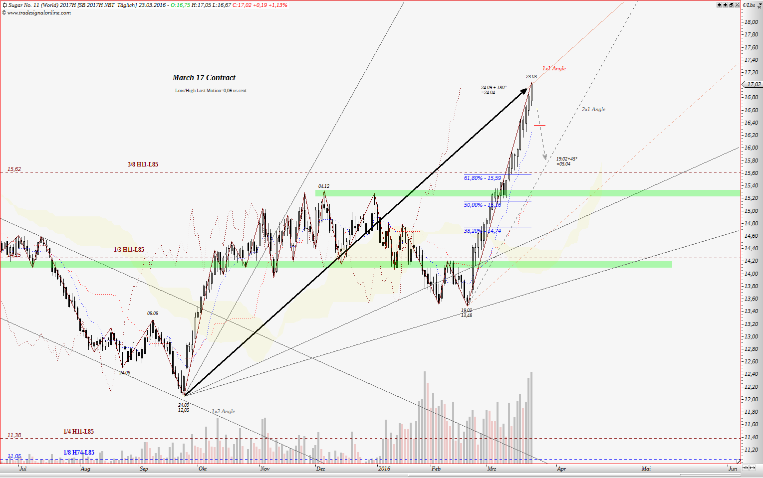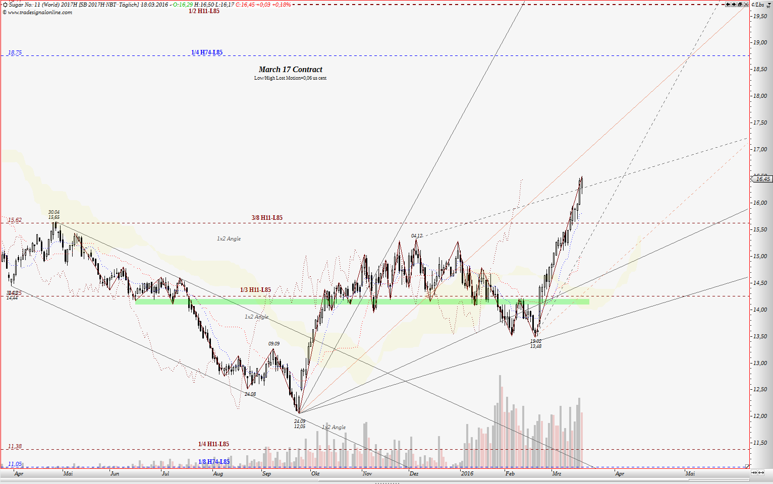wenn jemand meine frühere Treads gelesen hat, kennt noch die 3/8 Gann Linie. Für März 2016 Kontrakt war das ein starker Widerstand. Dort begann die Korrektur zw. Dezember und Februar.