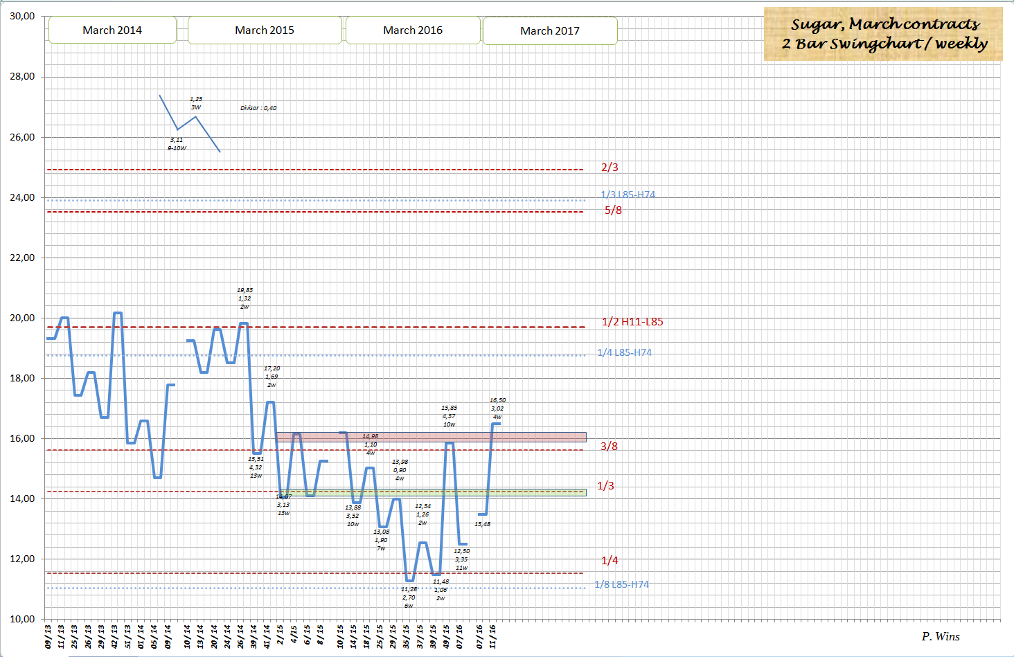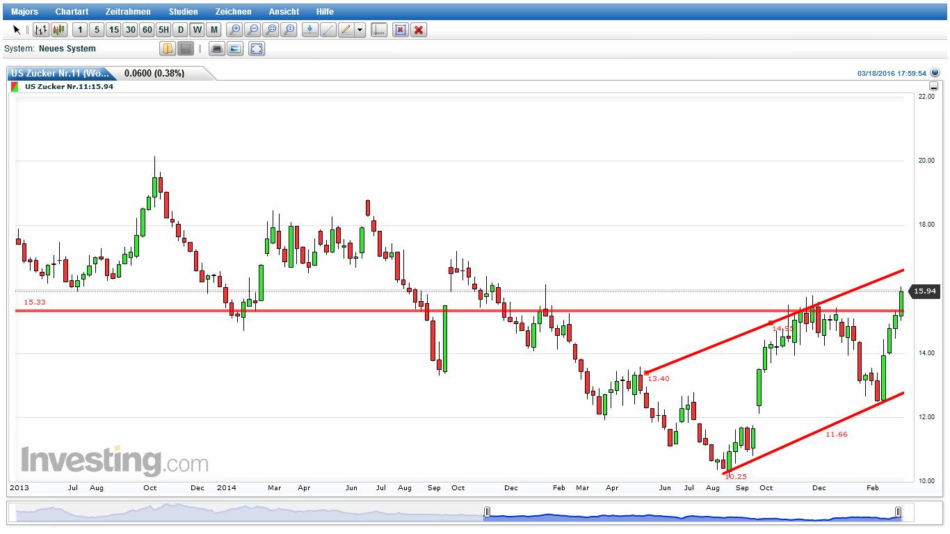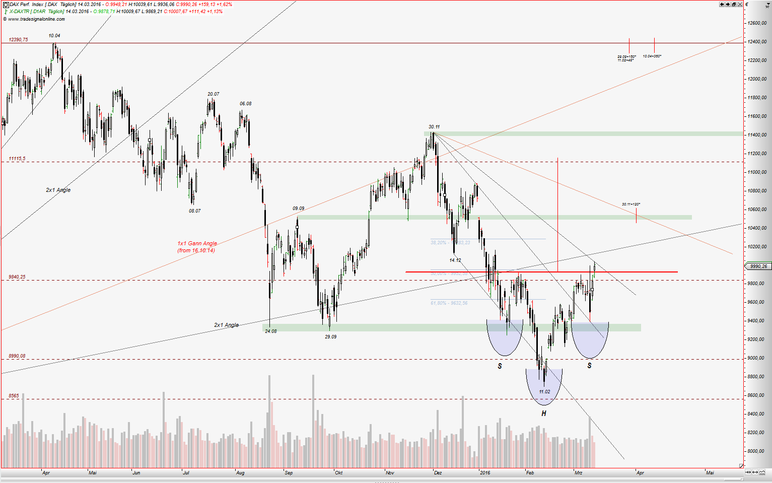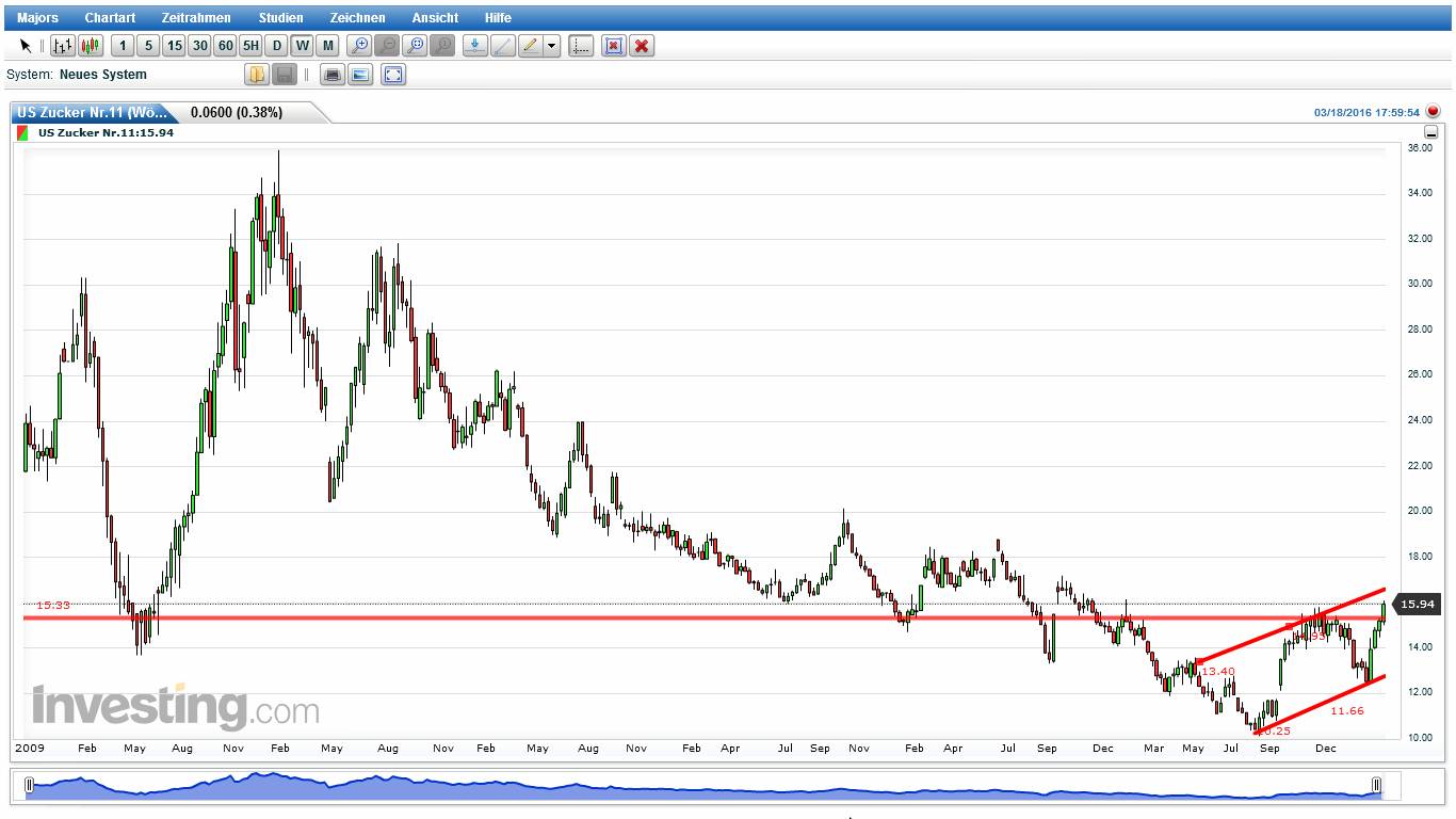 wenn jemand meine frühere Treads gelesen hat, kennt noch die 3/8 Gann Linie. Für März 2016 Kontrakt war das ein starker Widerstand. Dort begann die Korrektur zw. Dezember und Februar.