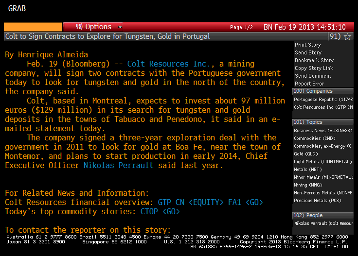 Colt's regional exploration results continue to support our belief that over time the project will develop into a world-class mining district. Demonstrating this will take time and money. Colt recognizes that there is a disconnect between valuation of resources in the ground and valuation of resources being mined profitably. Therefore Colt's decision to move towards development is based on economics and our desire to finance future regional exploration from revenue. Our high level of confidence in the Boa Fé/Montemor projects supports our decision to commence a Feasibility study during Q2, 2013. We expect to have this completed by year end. In parallel, we have completed the majority of the anticipated work required for the Environmental Impact Assessment (EIA). In April, a scheduled public review period will take place, paving the way for final approval. The EIA will be used as a blueprint designed to mitigate the impact of mining while generating value in an economically depressed region of Portugal."
